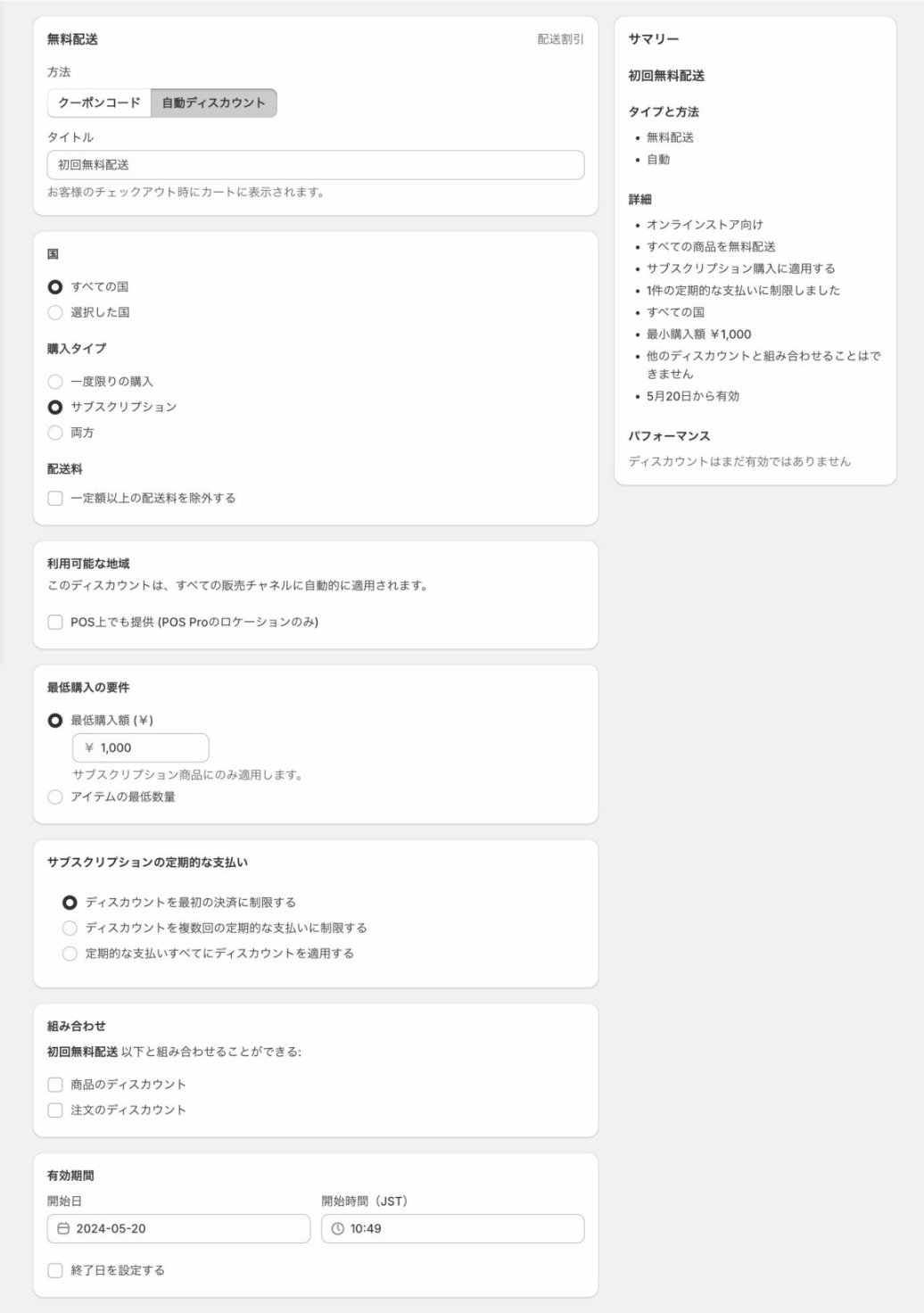 「自動ディスカウント」を設定し、購入タイプを「サブスクリプション」に指定