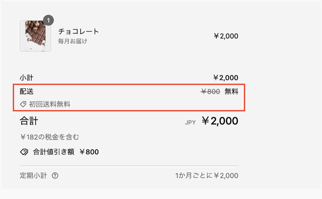 初回注文:チェックアウト画面で、定期購入のみに送料無料のディスカウントが自動的に適用されます。