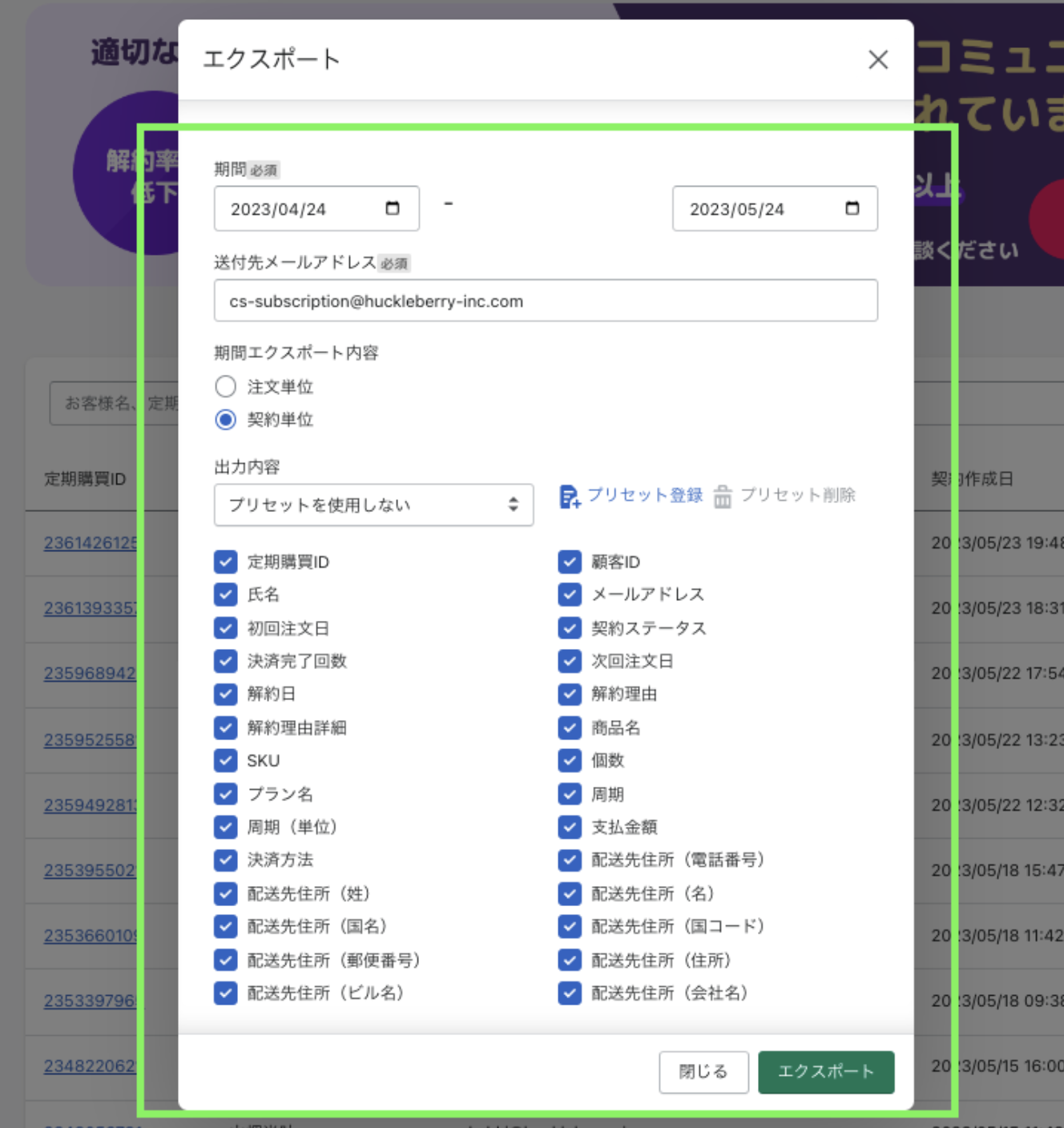 定期購買アプリのエクスポート機能を活用して契約データを分析することが可能です。