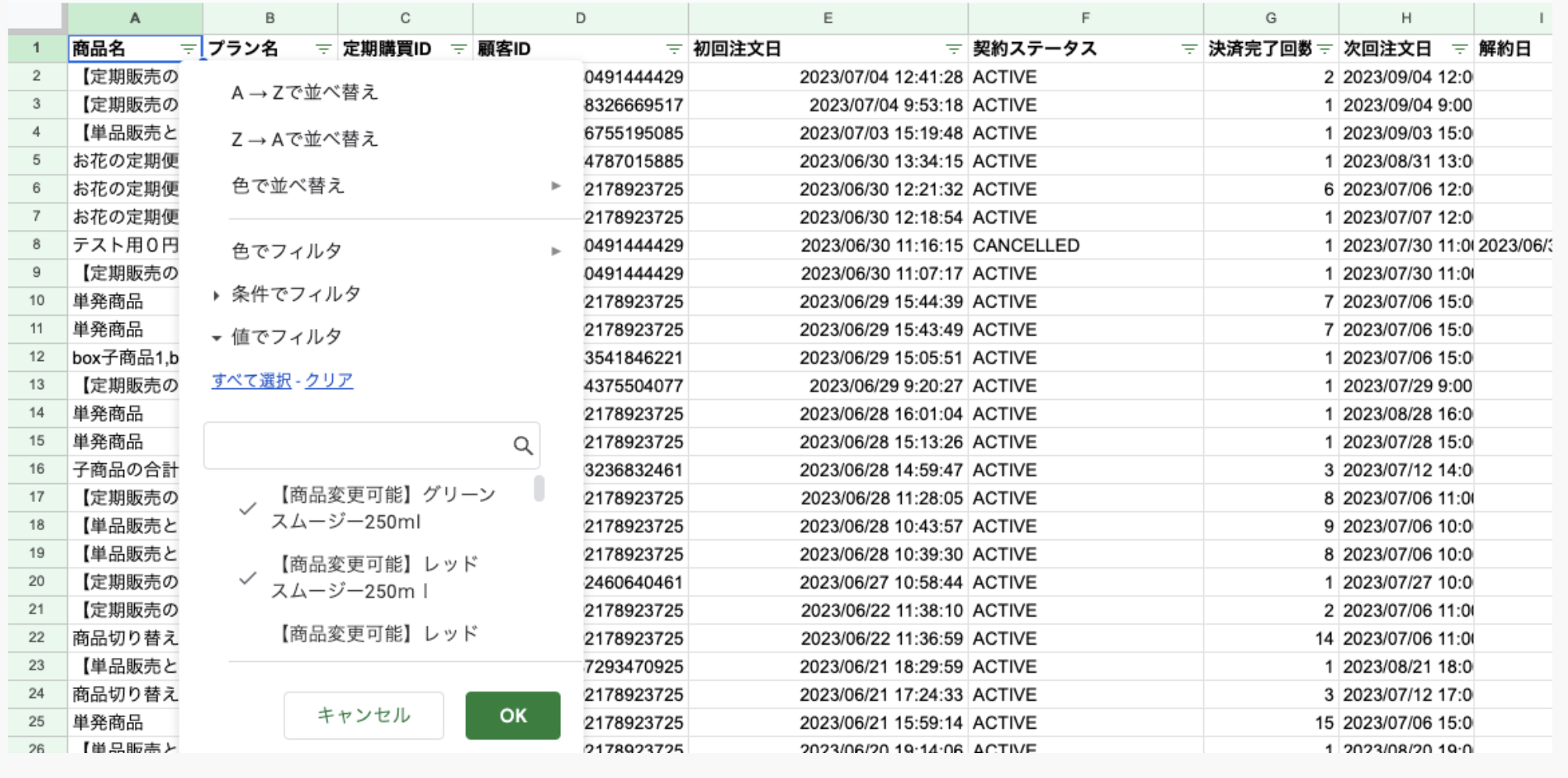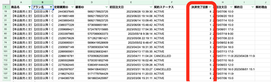 これにより、確認したい「商品名」「プラン名」において、各契約ごとにどれだけ「決済完了回数」を重ねているのかが確認できます。
