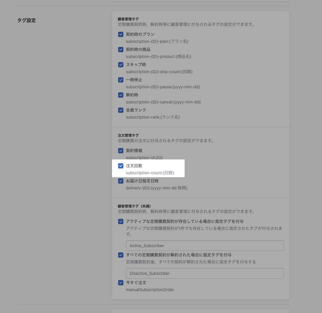 定期購買アプリ 一般設定>タグ設定>注文管理タグ>注文回数 を有効にしておく