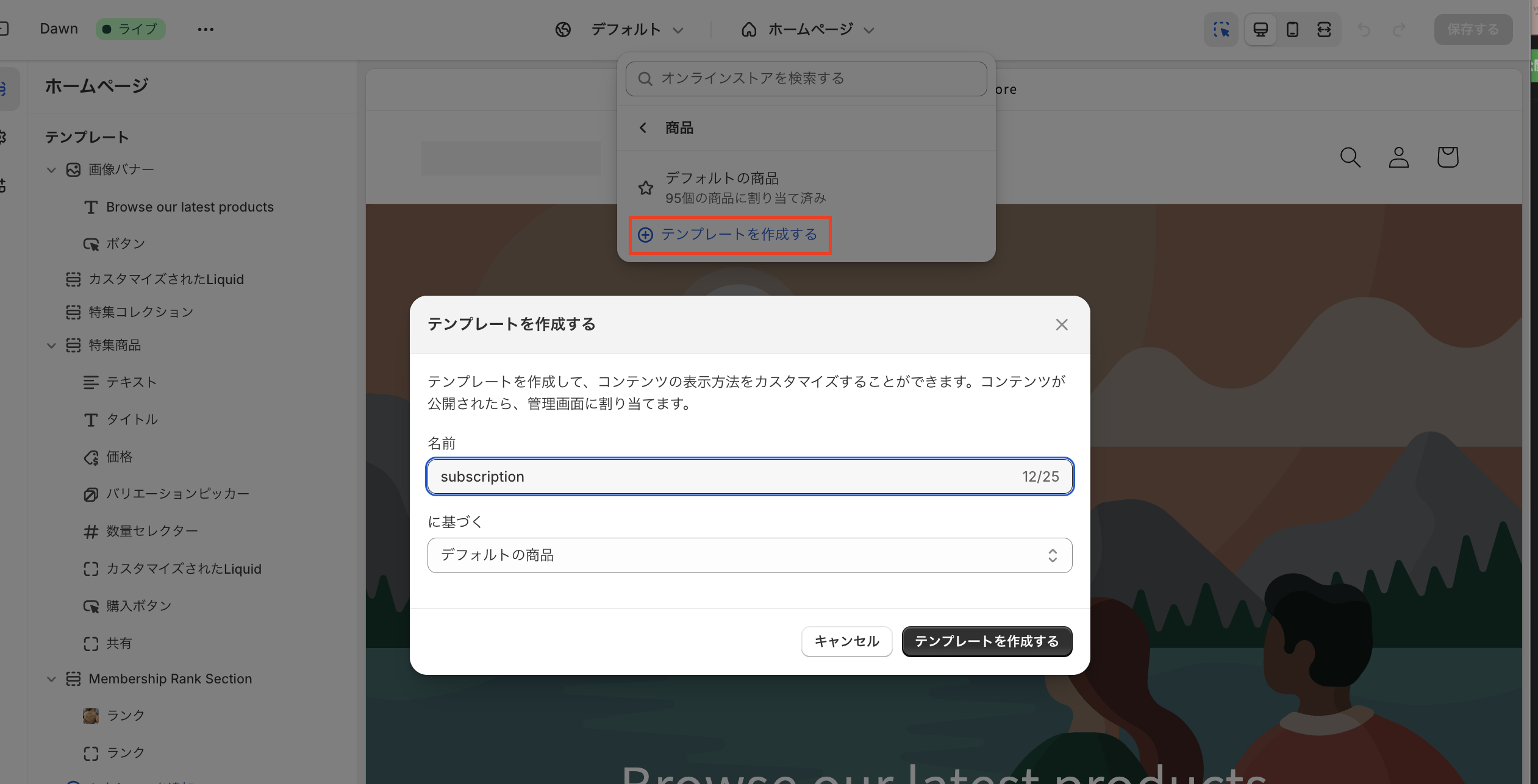 テーマのカスタマイズ画面にて、商品セクションにカスタムLiquidブロックを設置。