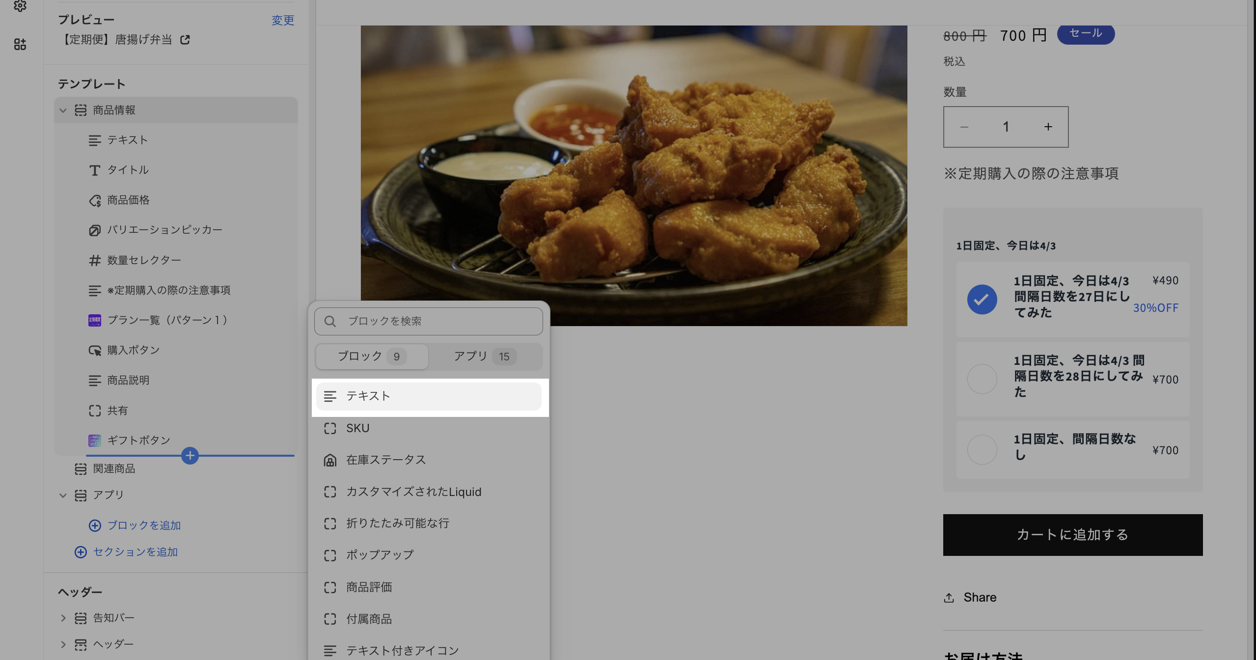 テーマのカスタマイズ画面へ戻り、商品セクションにテキストブロックなどを追加。