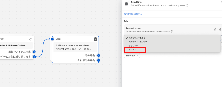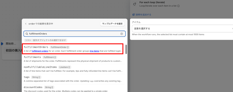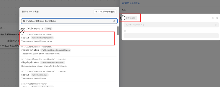 「変数を追加」押下後、「Fulfillment Orders Item/Status」を指定