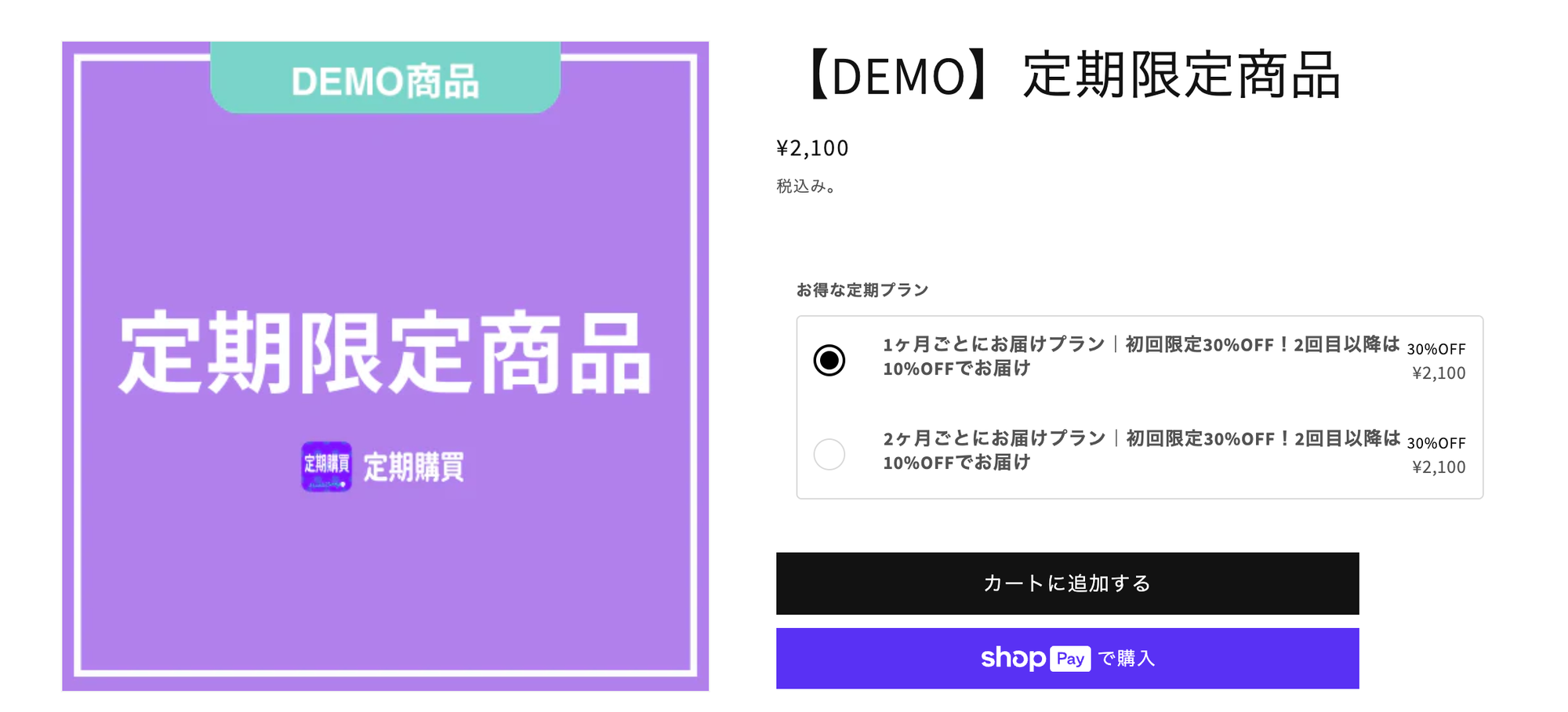 商品概要 本商品は、定期限定商品です。 定期購買のみ可能な設定にした場合、このような表示となります。 設定方法 下記ヘルプページをご覧ください。https://docs.channel.io/subscription/ja/articles/7b8a106c-定期限定商品