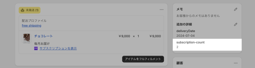 上記手順により、注文管理の「追加の詳細に決済回数が反映されるようになります。