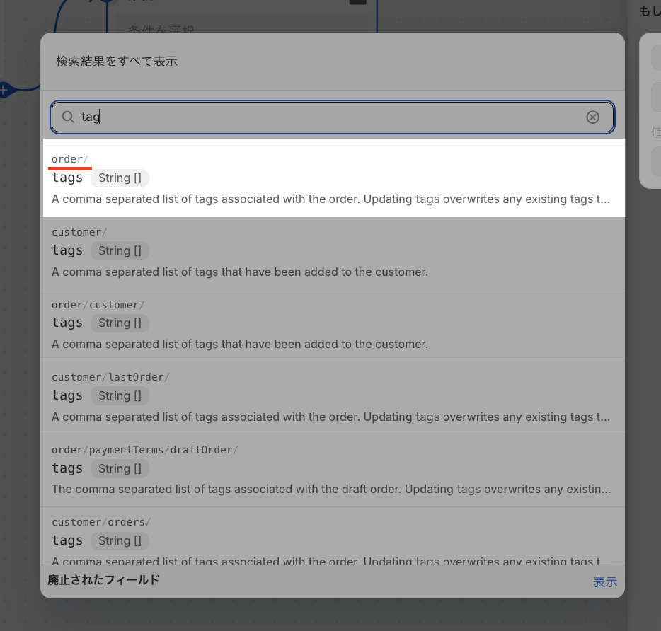 変数を追加ボタンをクリックし、検索窓にtagsと打ち込み、「order/」と書いてあるtagsを選択します