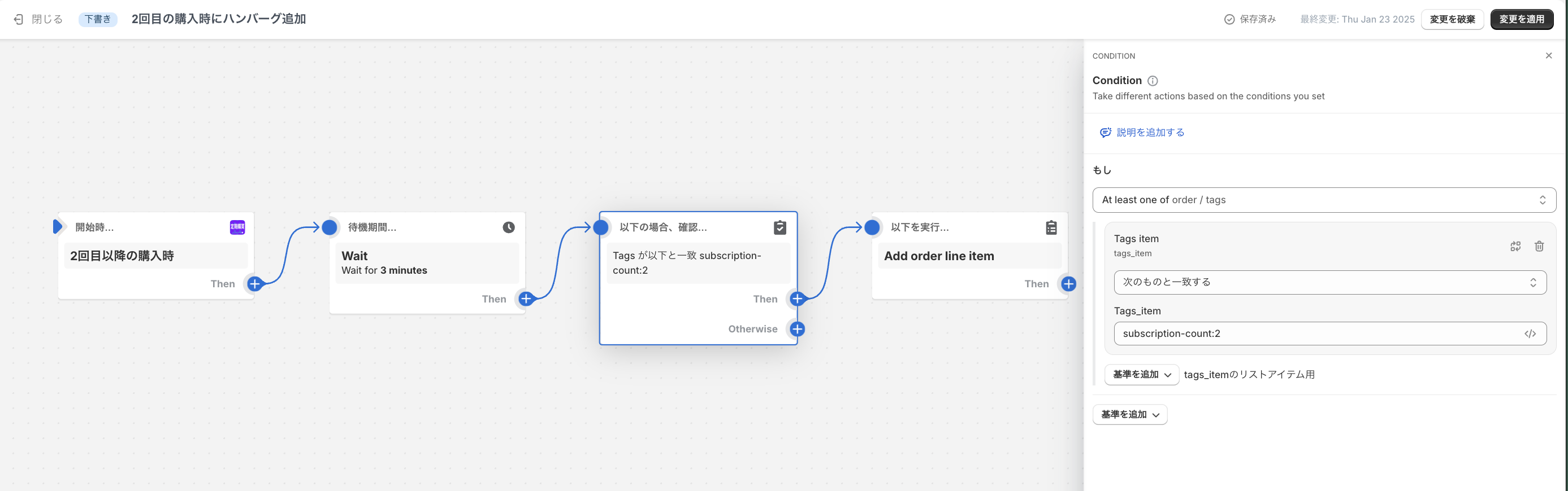 ※注文作成時に自動的に付与されるsubscription-count:注文回数の数字 のタグを利用し、「注文タグにsubscription-count:2が存在していたら…」という条件をつくります。