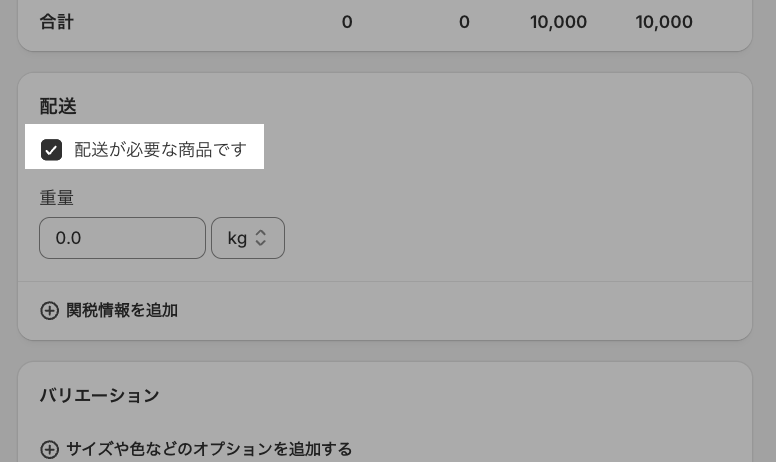 商品管理画面にて、配送ありの商品・配送なしの商品共に全て「配送あり商品」として登録する