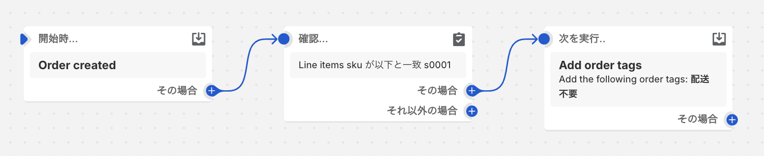 ShopifyFlowにて「配送を行わない商品のSKU(あるいはID)が含まれていたら、注文に『配送不要』タグを付与する」というFlowを作成する。