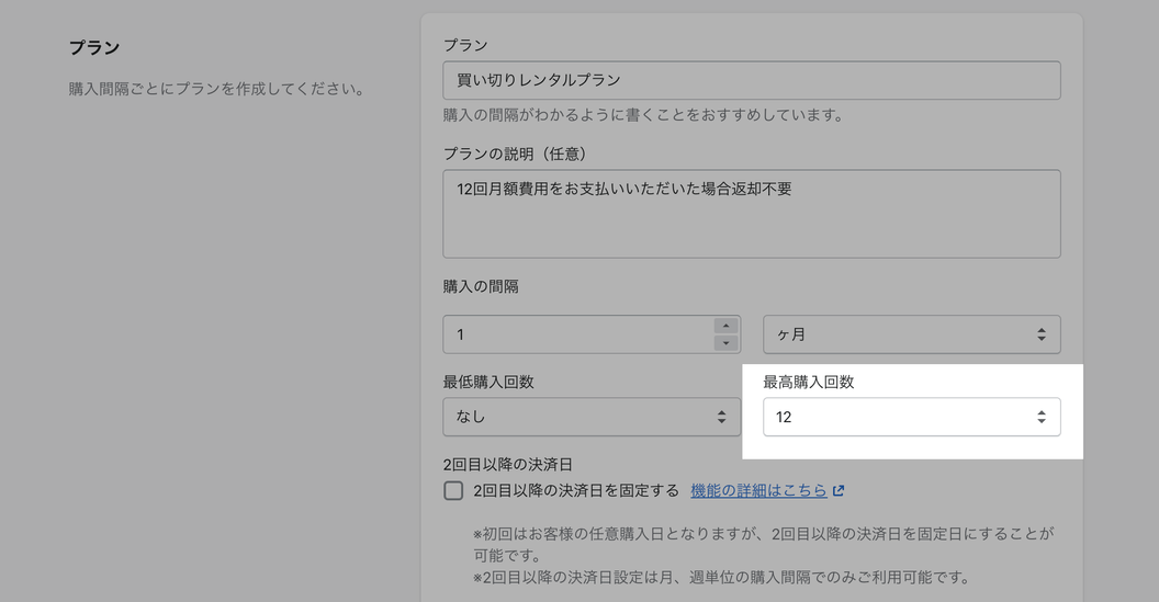 ・最高購入回数:12(購入回数の上限となる数字を入力)