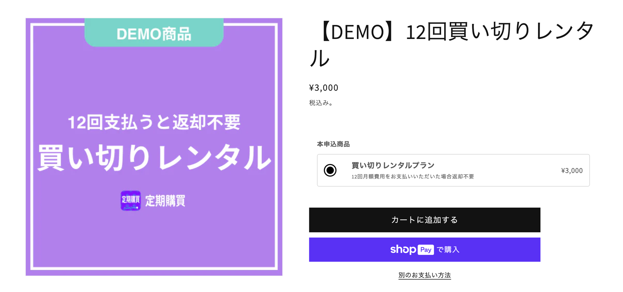 商品概要 本商品は、12回月額費用をお支払いいただいた場合返却不要(実質的な買い切り)といったように、規定の購入回数に達した場合は自動的に定期契約を解約処理することが可能です。 設定方法 下記ヘルプページをご覧ください。https://docs.channel.io/subscription/ja/articles/8fb168e8-12回買い切りレンタル