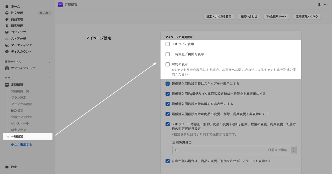 一般設定にて、顧客側から解約等できないよう設定しておく
