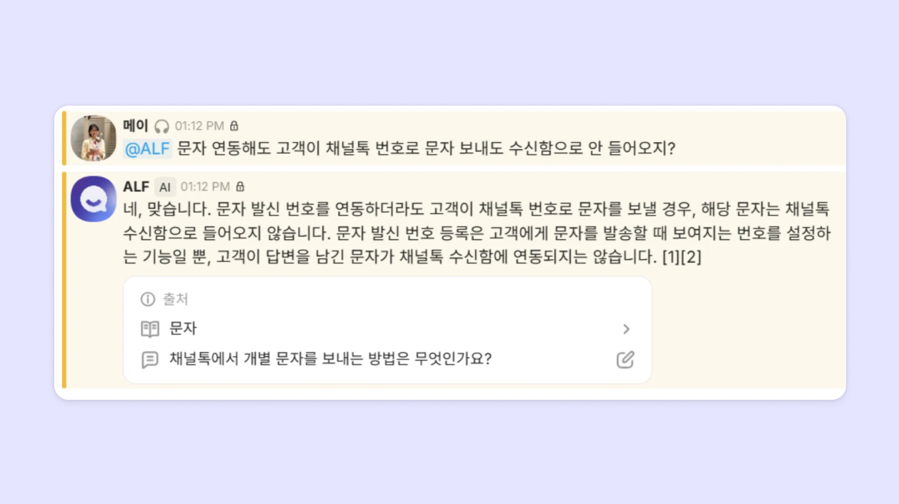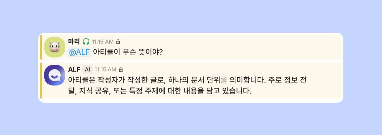 ALF가 채널에 등록된 FAQ와 아티클을 기반으로 고객에게 답변을 제공하듯이, AI 어시스턴트도 동일한 방식으로 여러분의 질문에 답변해 드릴 수 있어요.