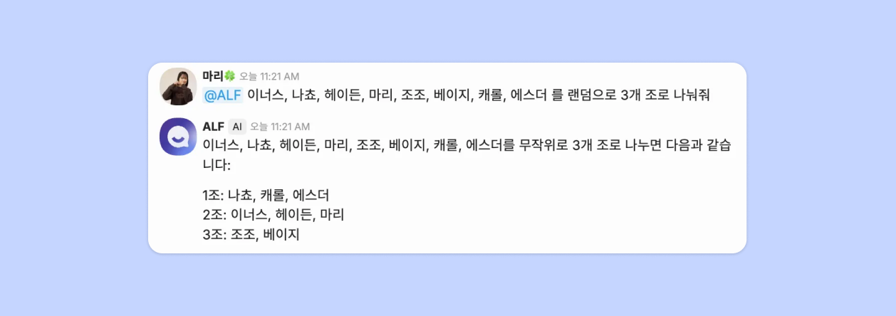 @ALF를 불러 메시지 정리, 공감 표현, 정보 검색 등 간단한 요청을 맡기고 더 중요한 업무에 집중해 보세요!