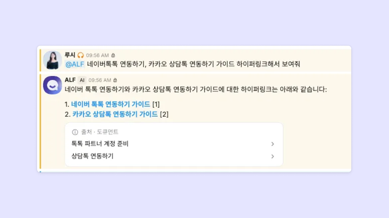 참고하면 좋을 가이드를 전달해 드려야 할 때, 가이드 페이지를 열지 않고도 @ALF를 불러 링크를 가져올 수 있어 답변 시간도 줄일 수 있었어요.