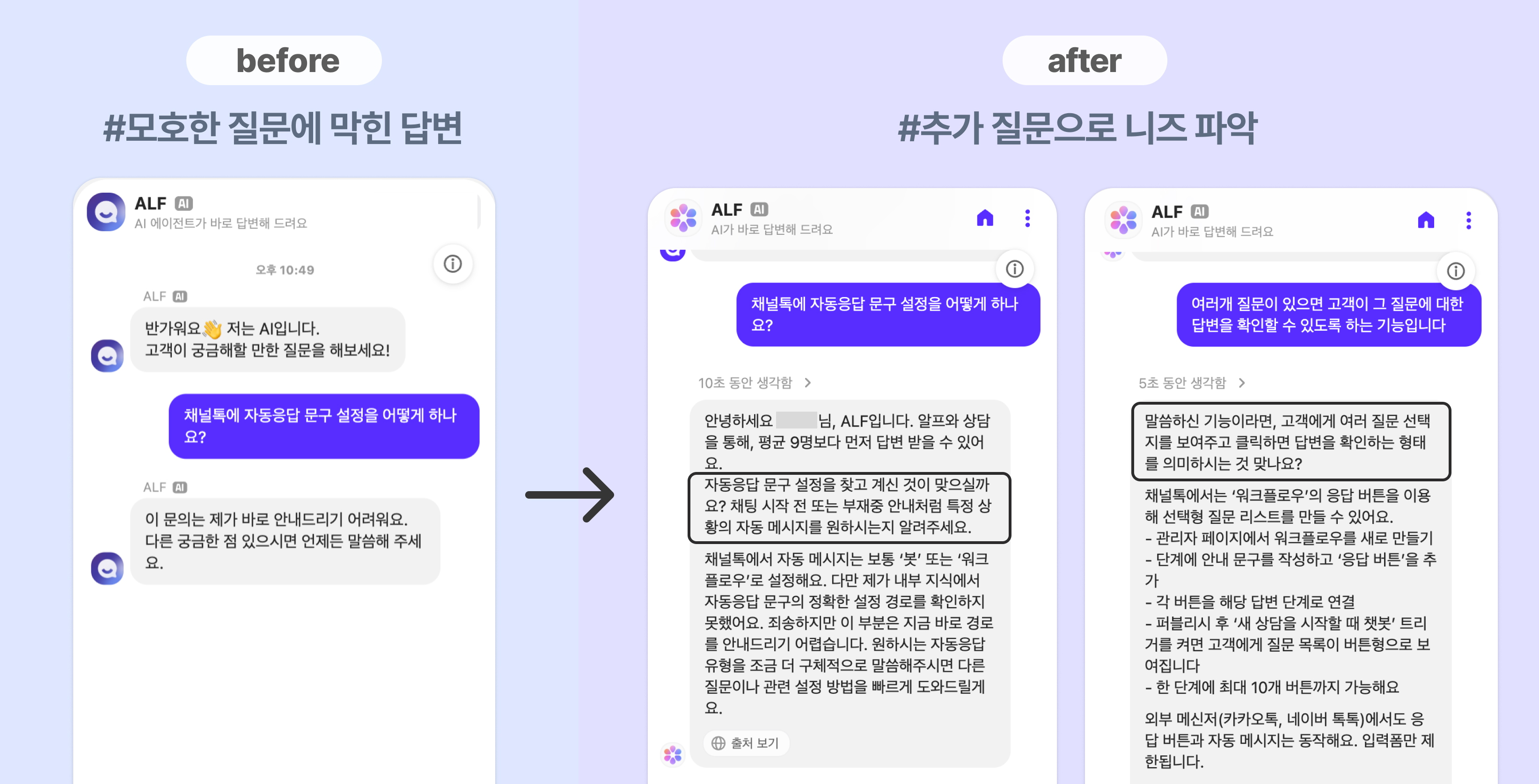 ALF v2는 단순히 답을 제시하지 않고, “혹시 이런 상황이 맞으신가요?” 처럼 상담을 주도하며 고객의 니즈를 이끌어냅니다.