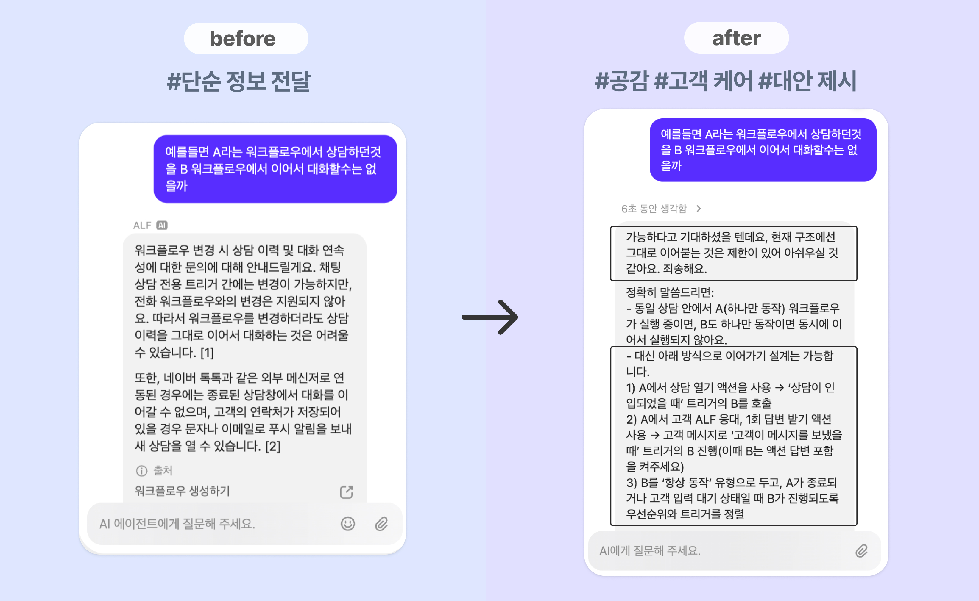 실제 상담원처럼 고객의 상황을 이해하고 함께 문제를 해결하는 대화형 상담으로 바뀌었습니다.