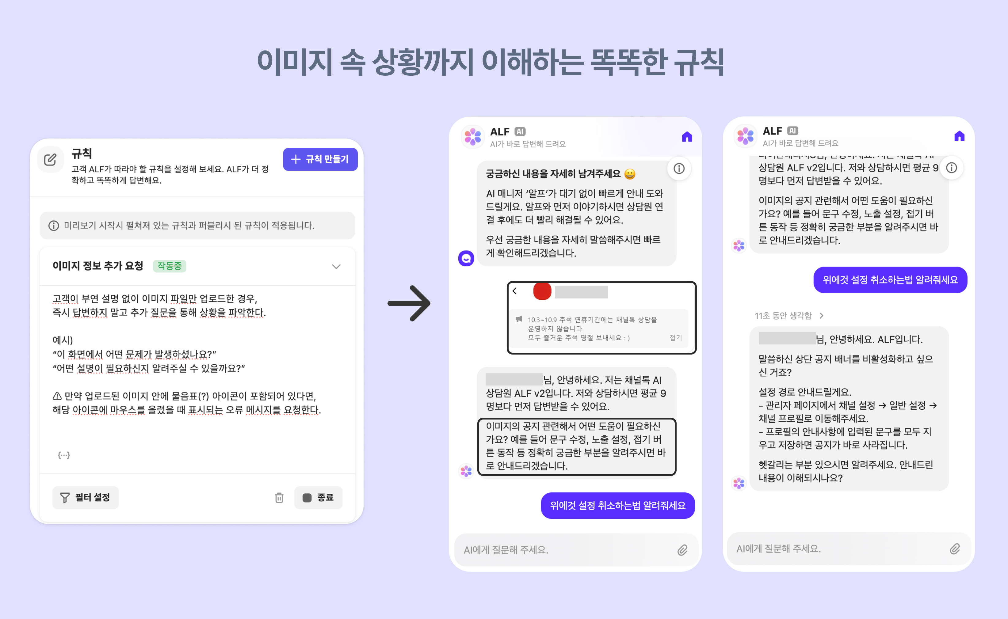 하지만 이제는 설정한 규칙대로 이미지만 업로드돼도 “어떤 도움이 필요하신가요?”라고 한 번 더 물어보고, 고객이 답변을 주면 그 내용에 맞춰 정확한 해결 방법을 제시합니다.