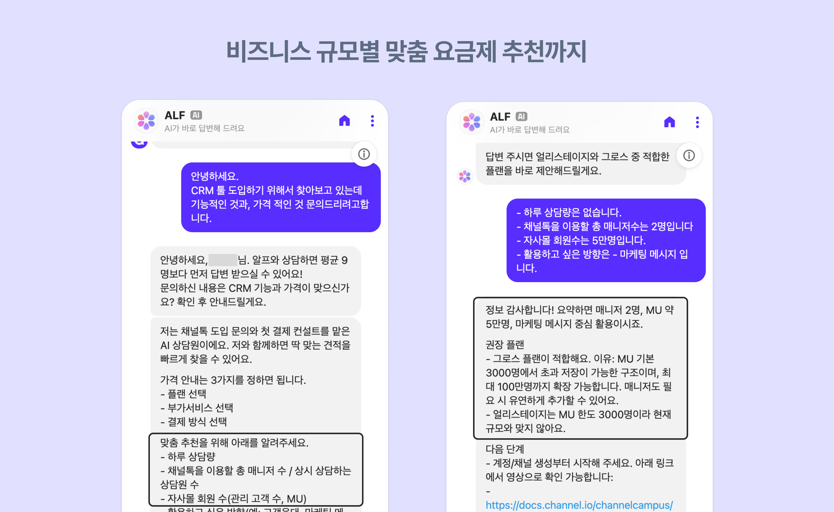 ALF는 이제 단순히 제품 설명에만 그치지 않고 고객의 규모와 목적을 이해하고, 맞춤형 요금 상담까지 진행합니다.