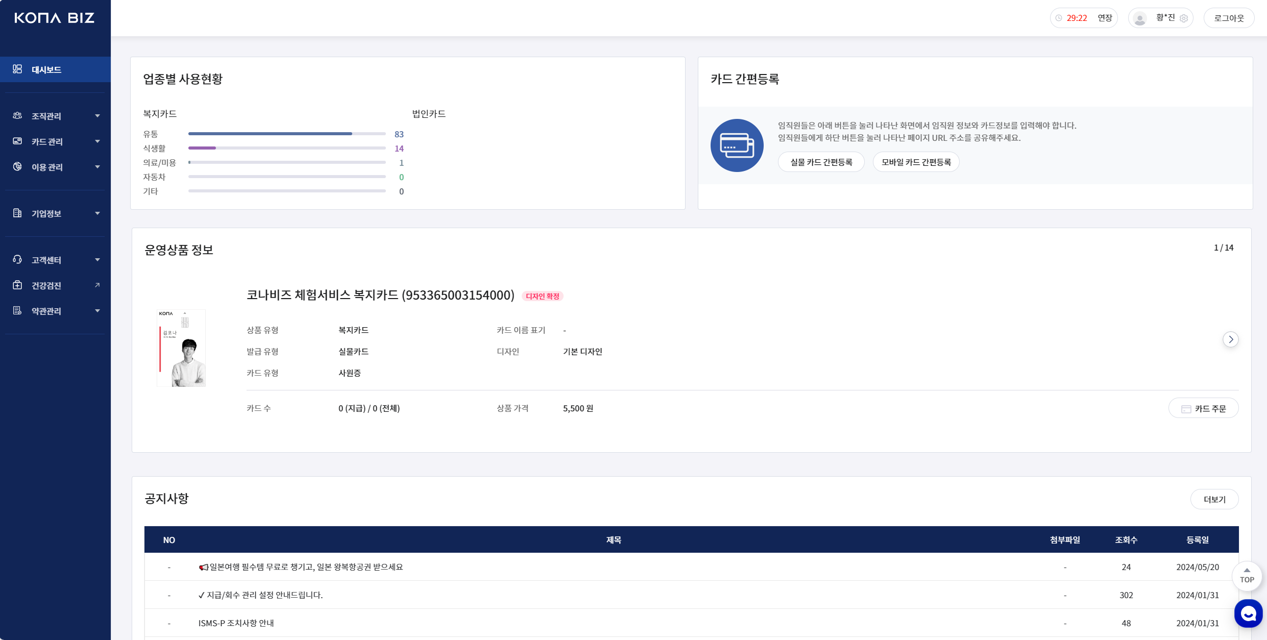 이용관리 | 카드 이용 내역 | 복지/법인카드 이용 내역 (가맹점명,업종,금액) |