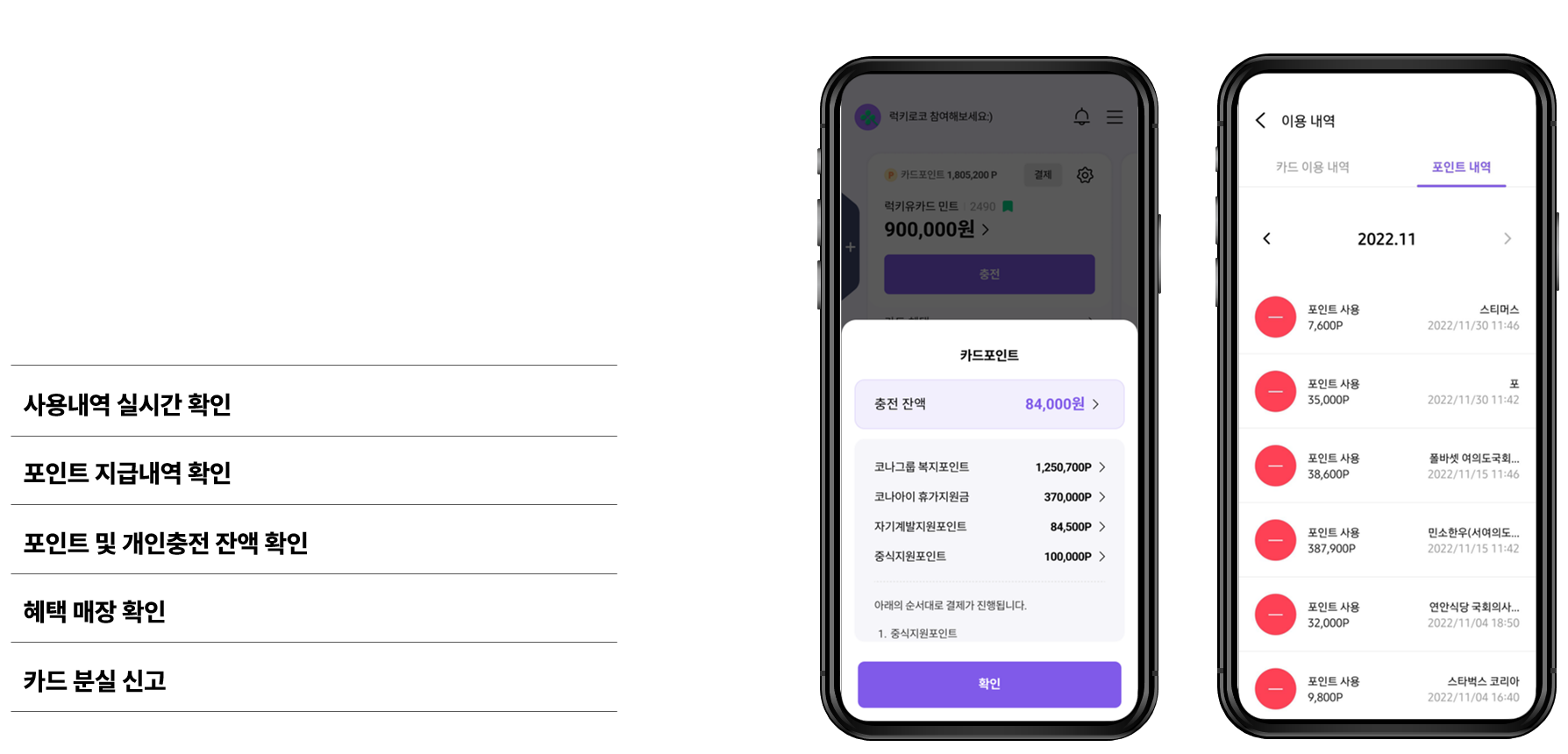 법인 카드 관리 | 임직원별 충전/사용/잔여포인트 확인 | |
