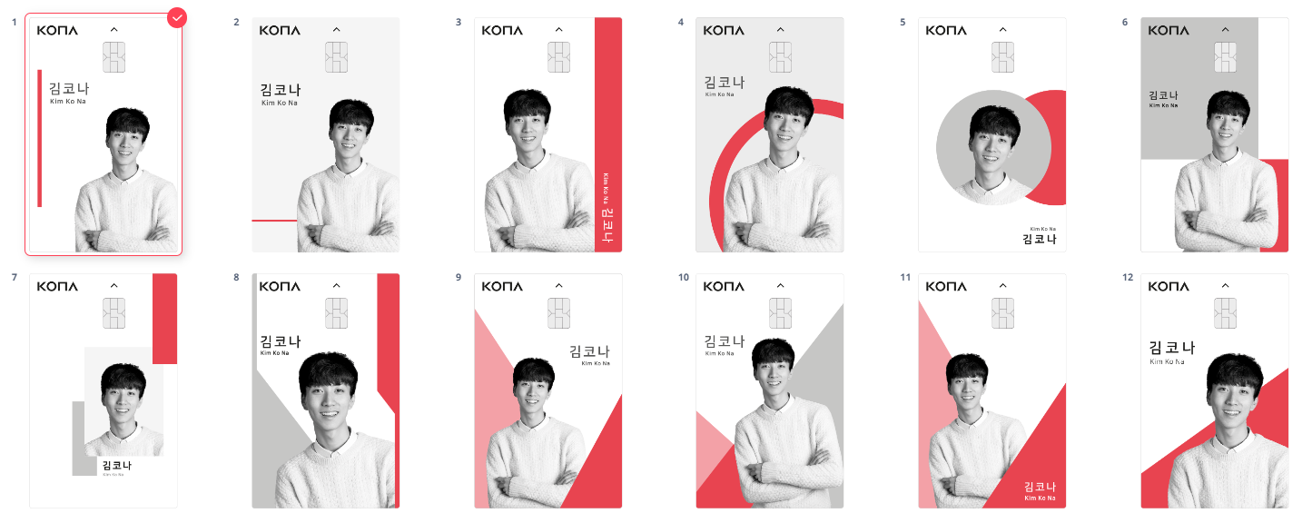 2) 코나비즈에서 주문으로 진행되는 카드는 앞면은 여백 + 뒷면(카드 번호 및 정보) 인쇄된 1차 제작 카드이며, 1차 인쇄 이후 협력사를 통해 앞면 인쇄 후 최종 제작 완료 및 배송이 진행됩니다.