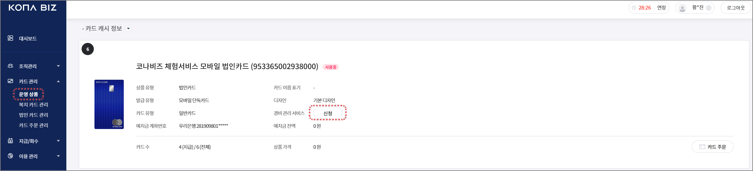 방법 : [운영상품] - [법인카드 상품] - [경비 관리서비스] - 신청
