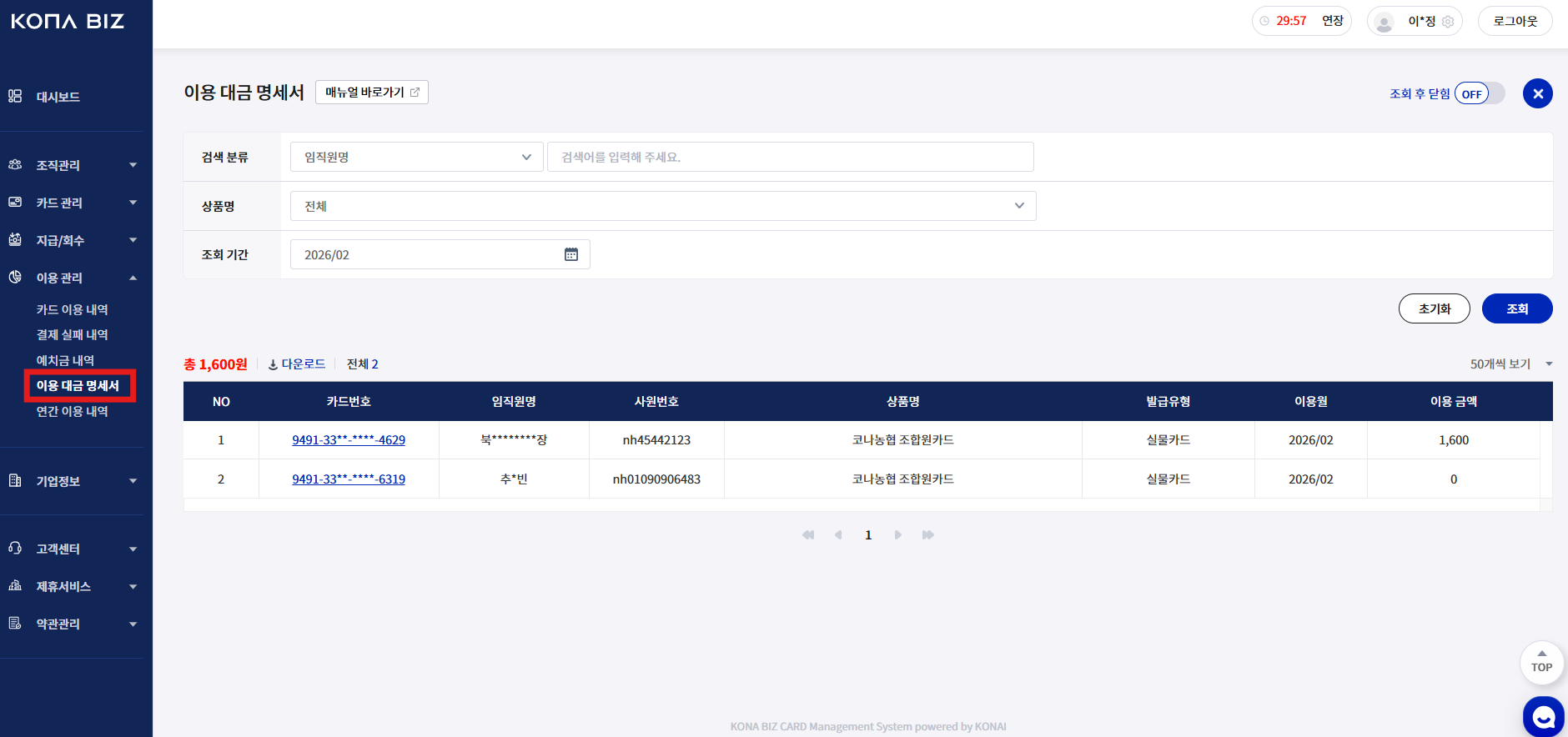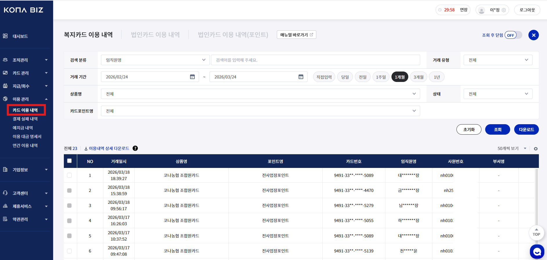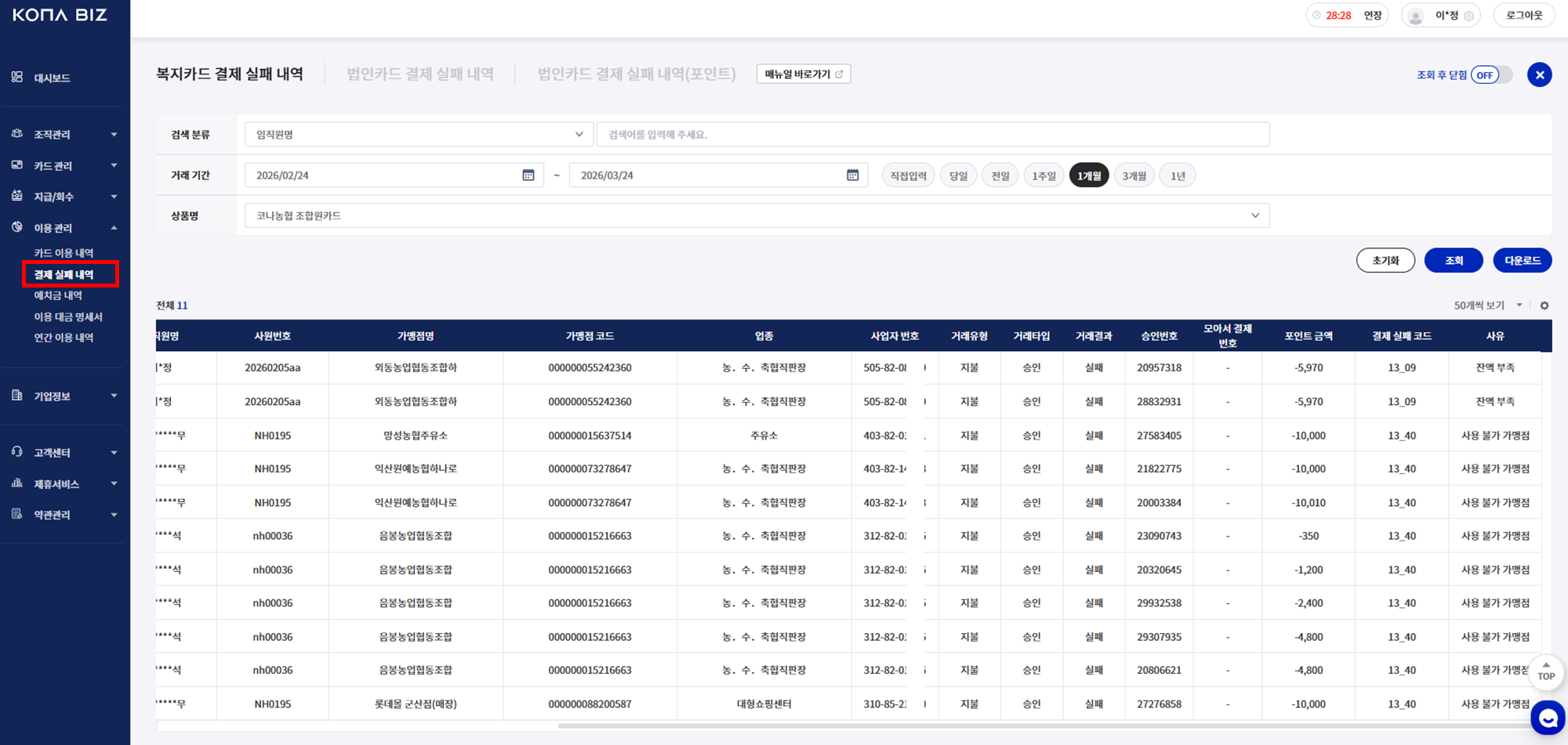 관리자페이지를 통해 임직원별 복지카드/법인카드 이용 내역을 확인할 수 있습니다.