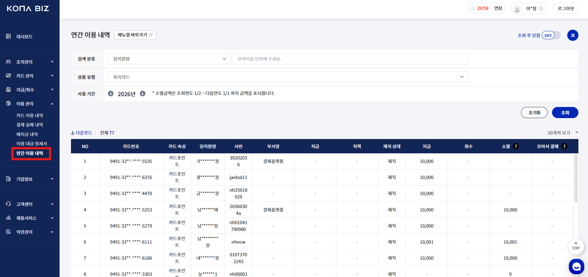 임직원 연간 이용금액 합계 확인이 가능합니다.