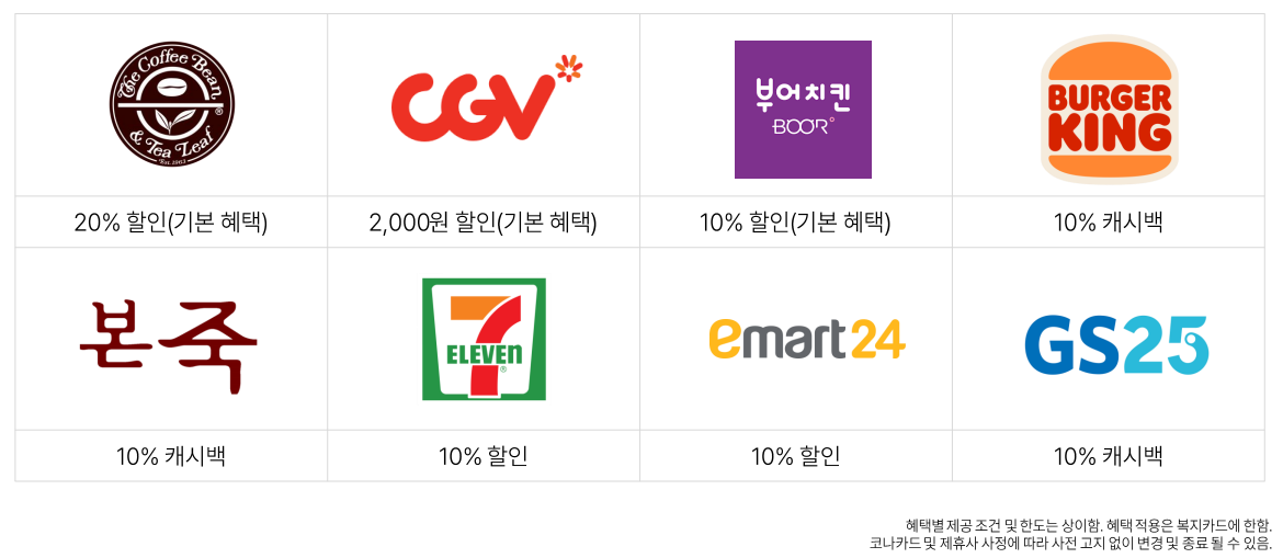 복지카드에 한해서만 가능하며, 상세 내용은 코나카드앱을 통해 확인하시기 바랍니다. 내용은 변경 및 종료될 수 있습니다.