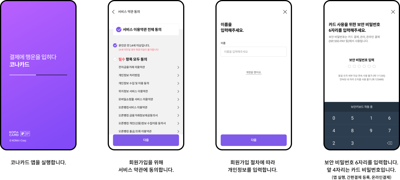 코나카드 서비스를 이용하기 위해 앱에서 안내하는 순서에 따라 회원가입 절차를 진행합니다.