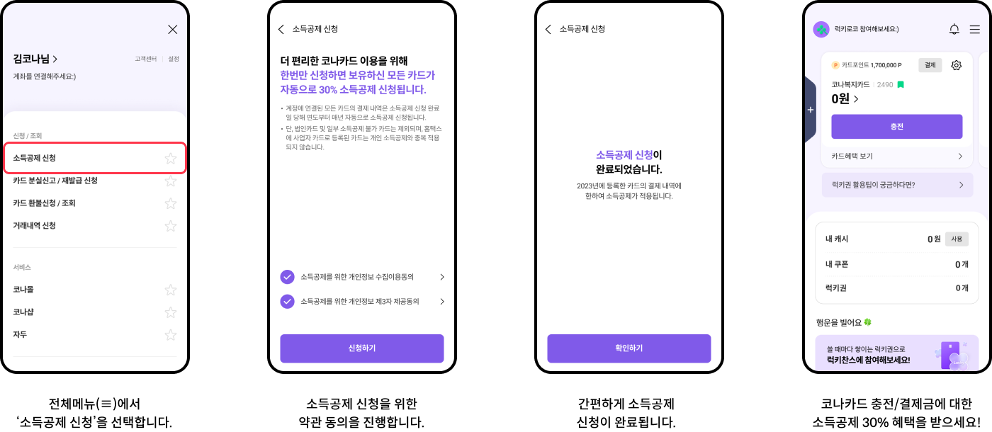코나카드 사용 시 소득공제 30%의 혜택을 받을 수 있으니 미리 꼭! 신청해주시는게 좋습니다.