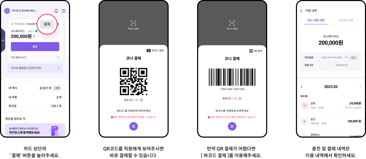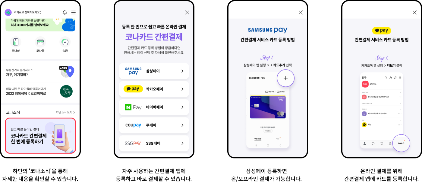 간편결제 시 카드 비밀번호는 코나카드 앱 비밀번호 앞4자리 입니다.