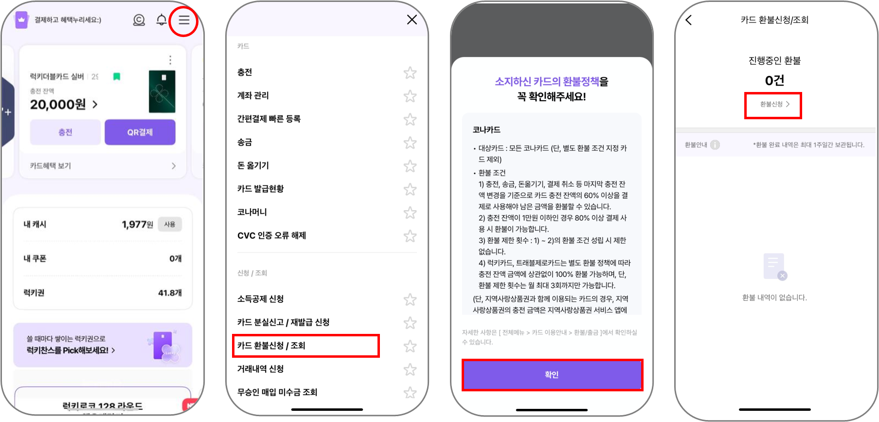 코나카드 앱에서 개인이 충전한 잔액을 환불 요청하는 방법