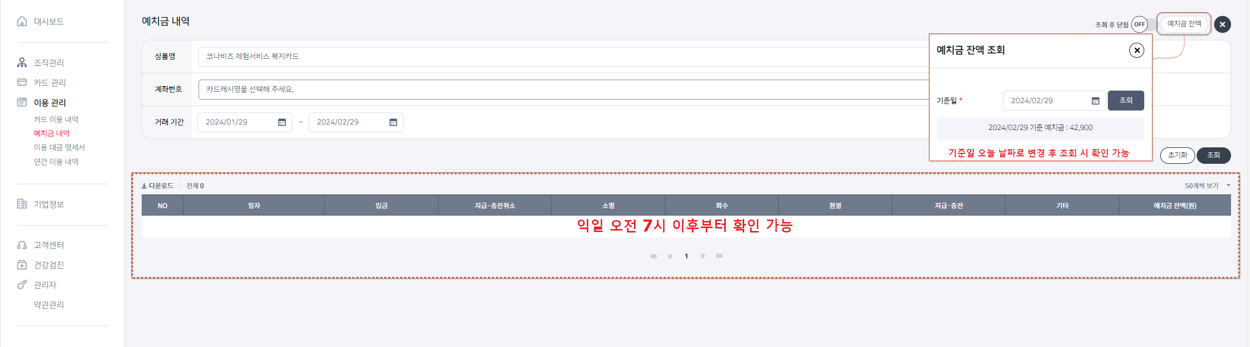 사용기간 만료로 인한 포인트, 또는 회수를 진행할 경우 자동 예치금 계좌로 환수됩니다. 예치금 내역 메뉴에서 내역은 익일부터 조회 가능합니다. (*환수는 즉시 처리됩니다.)이용관리>예치금 내역