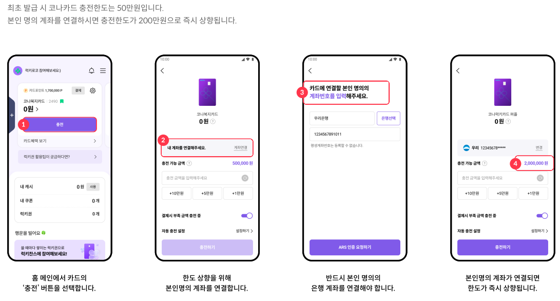 고객님께서 본인 명의 계좌를 코나카드에 연결하시면, 충전 한도가 즉시 200만원으로 상향됩니다. 이를 통해 더 높은 금액의 결제도 문제 없이 진행하실 수 있습니다.