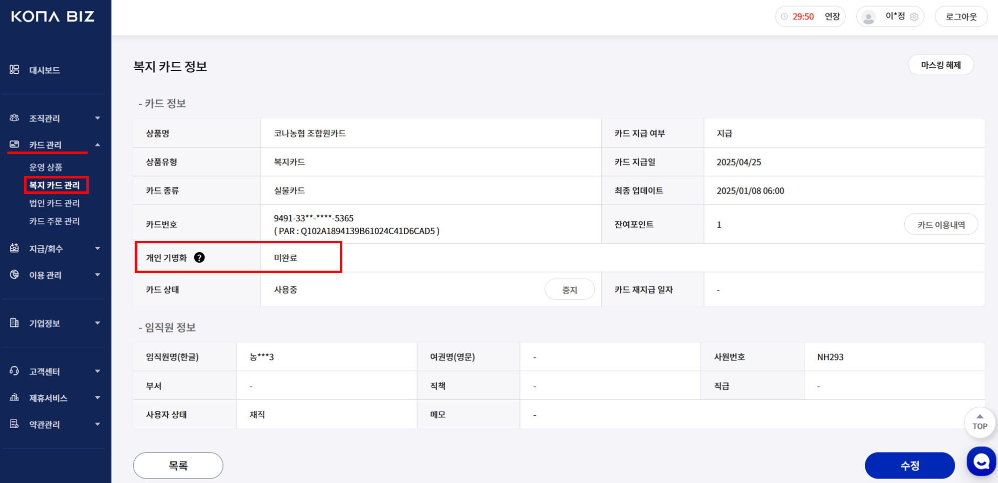임직원이 카드 한도 상향 관련 문의를 할 경우, 관리포탈에서 개인 기명화 여부 확인 가능합니다!