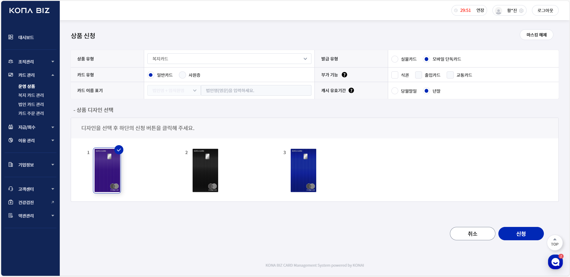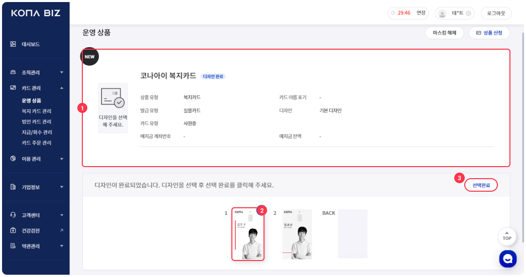 [카드관리] - [운영 상품] 에서 디자인을 확인 후 선택완료 해주세요.