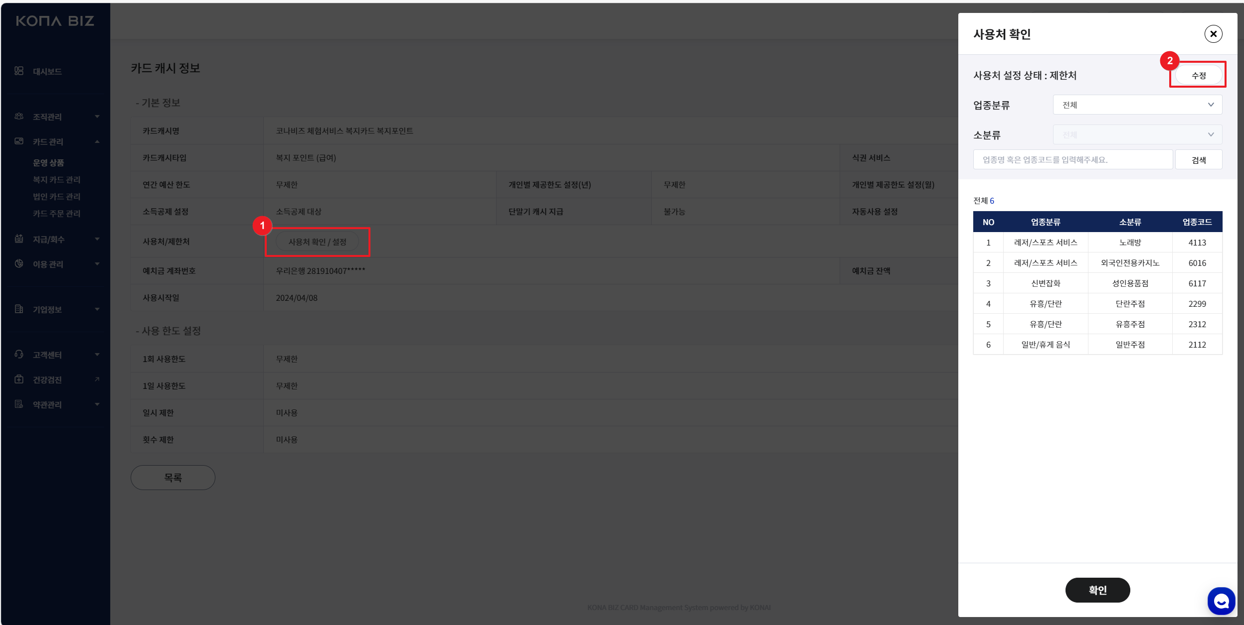 [사용처 or 제한처 확인 / 설정] - [수정] 클릭