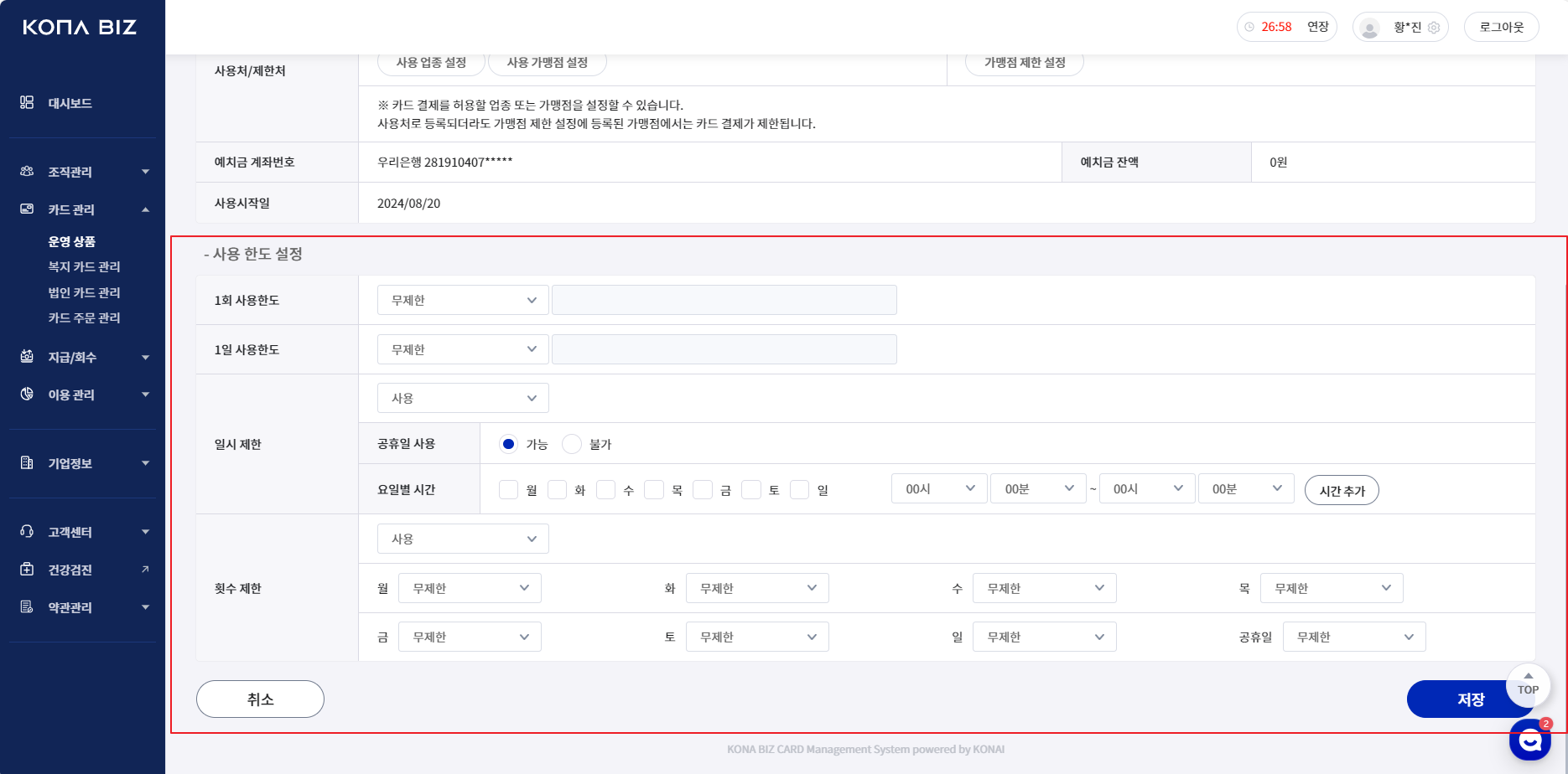 생성 완료된 카드의 사용처 또는 제한처를 별도로 설정하고 싶은 경우 아래와 같이 진행해 주세요.