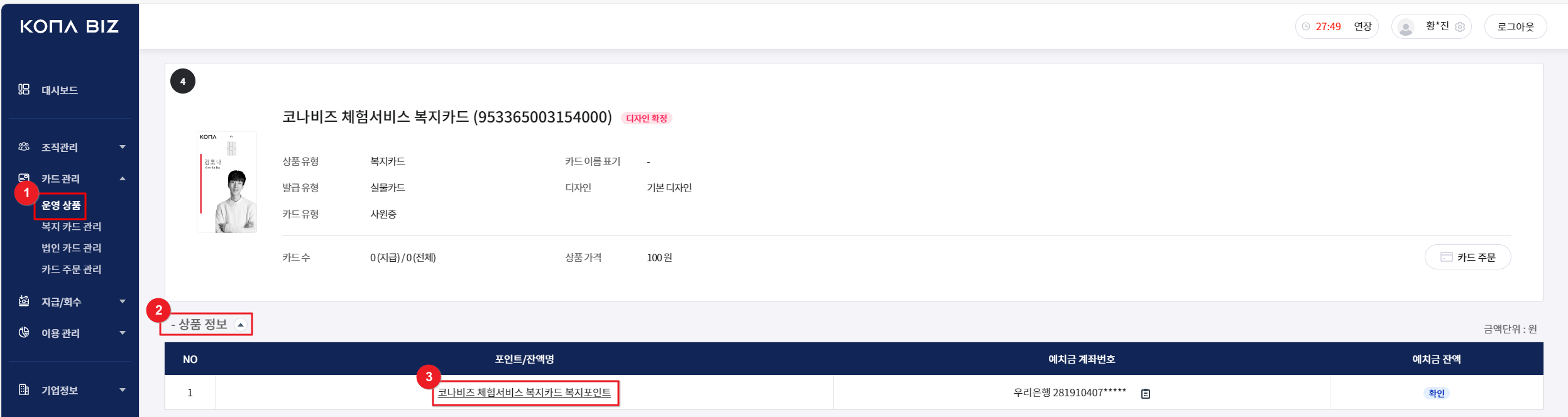 [카드관리] - [운영상품] - [포인트/잔액명] 클릭