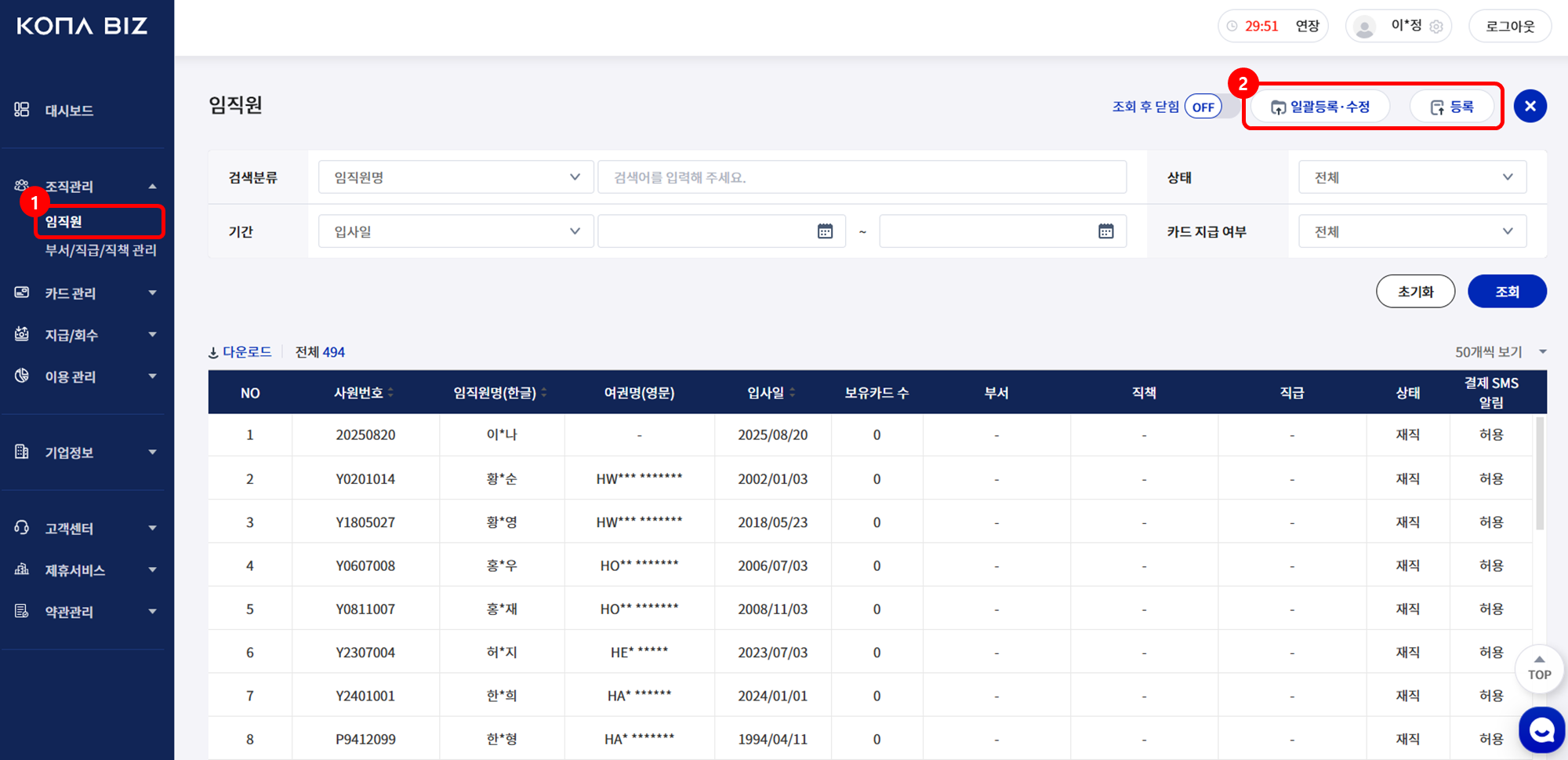 수령 카드 간편등록 시 임직원이 사번을 입력, 카드매핑 시 사용 됩니다.