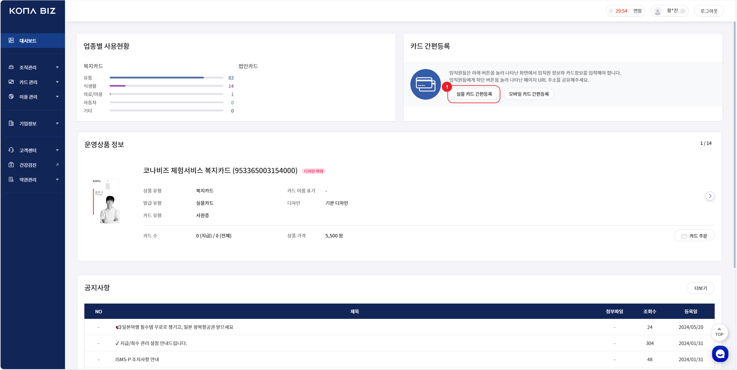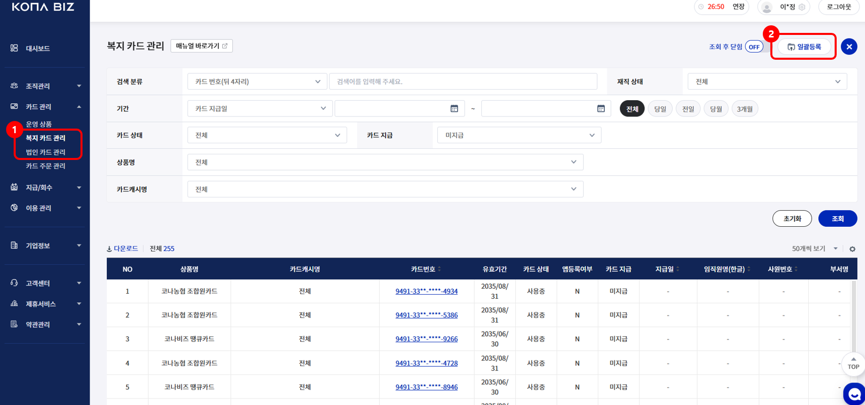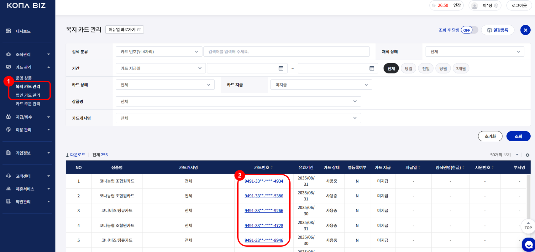 ① 메뉴 [운영상품]-[복지 or 법인 카드 관리] 접속
