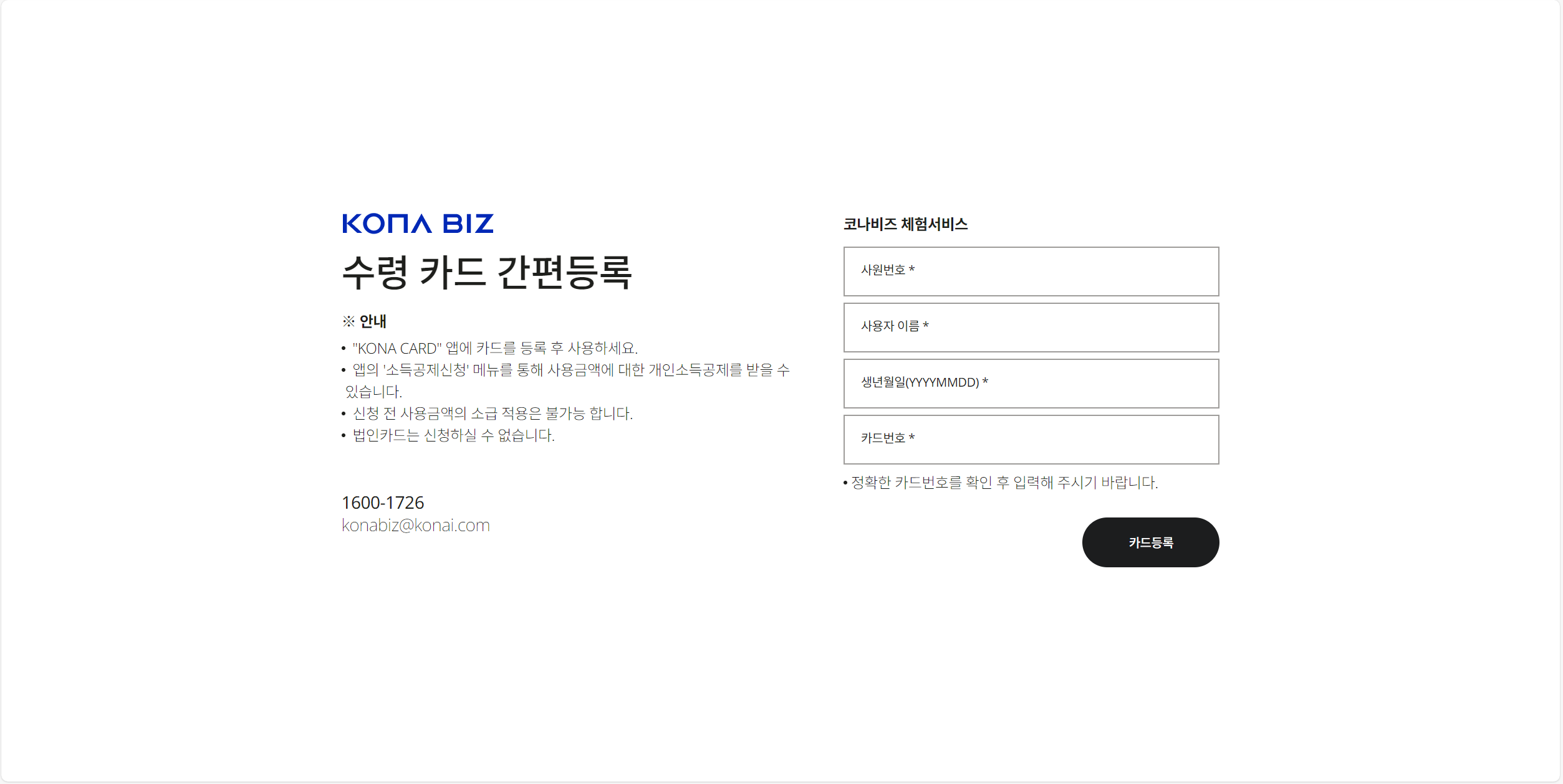 관리포탈에 미리 입력한 임직원 정보와 일치해야만 카드 등록이 가능합니다.