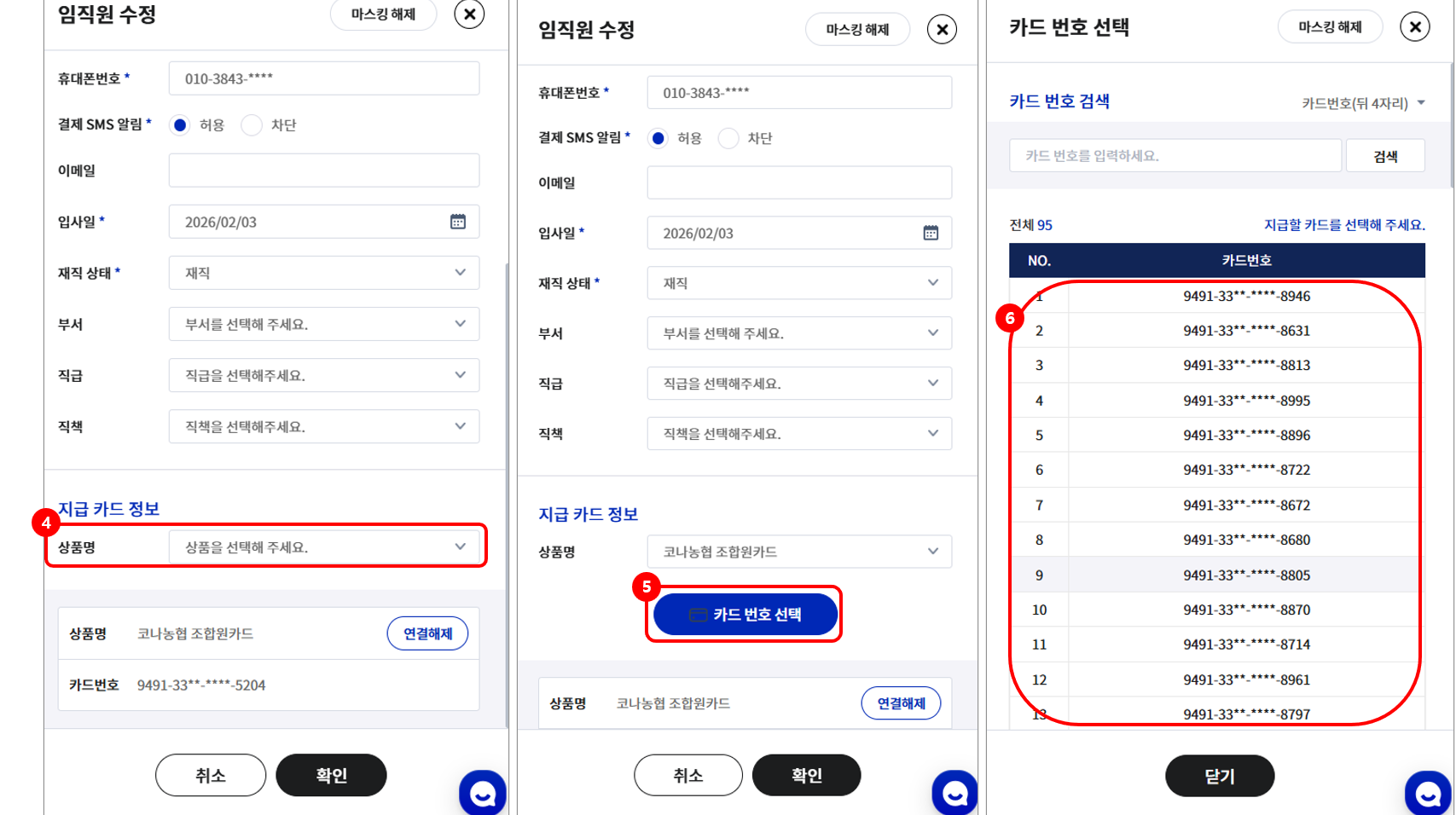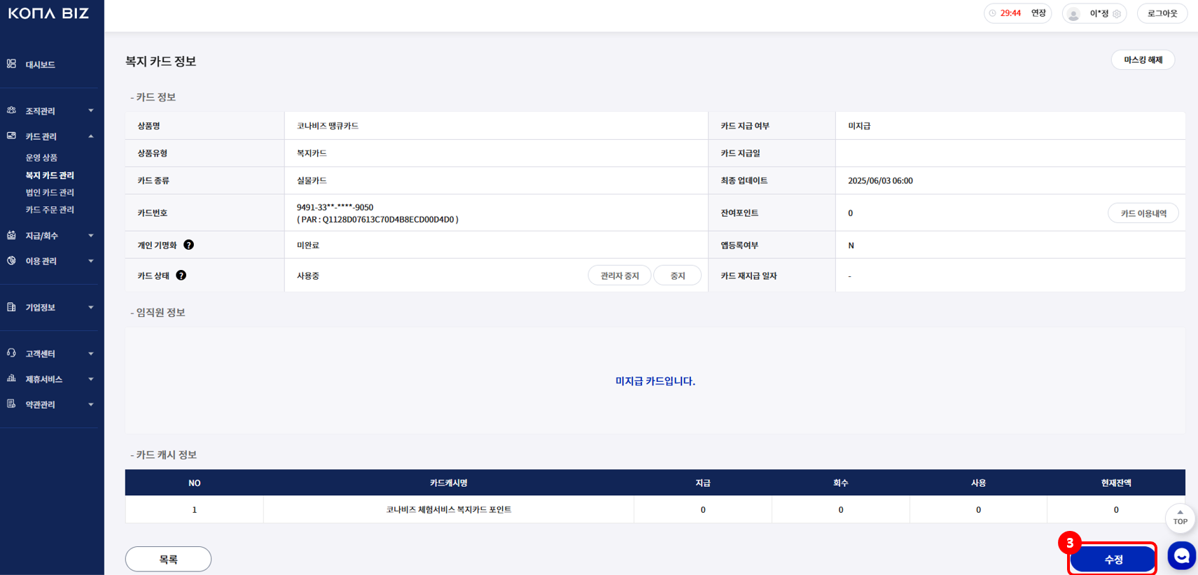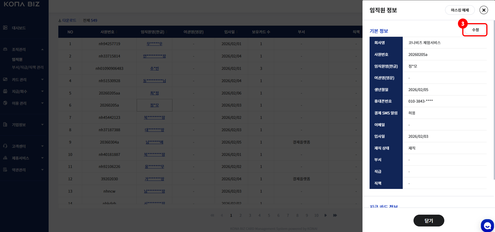 임직원 정보를 등록하거나 수정하면서 지급카드 정보를 수정할 수 있습니다.