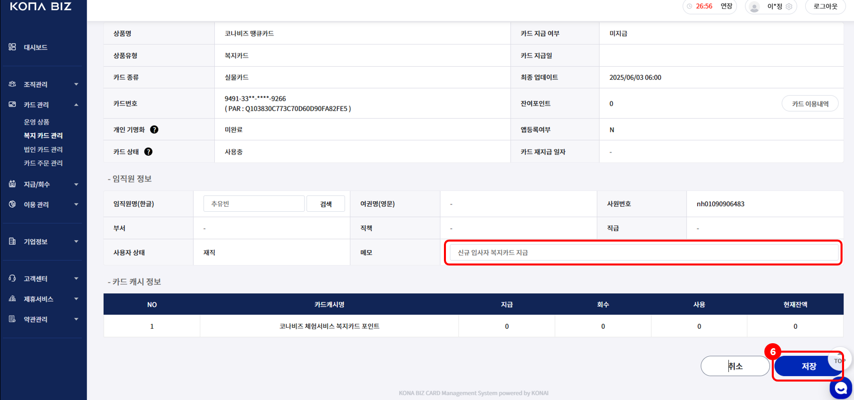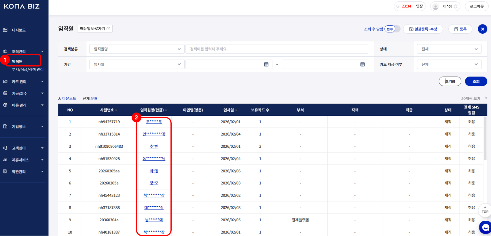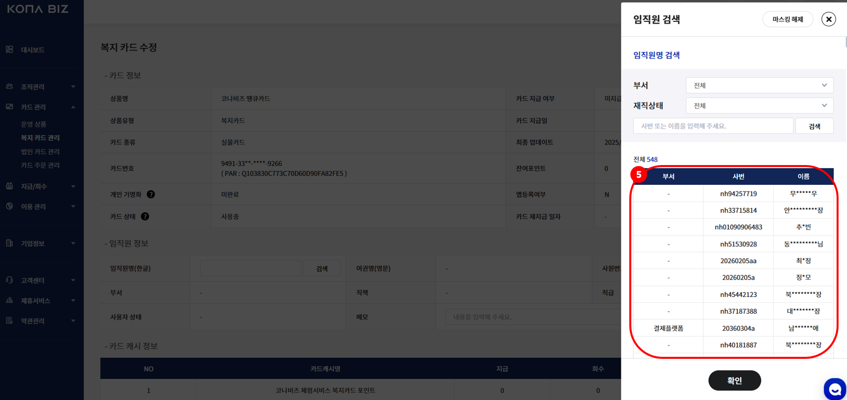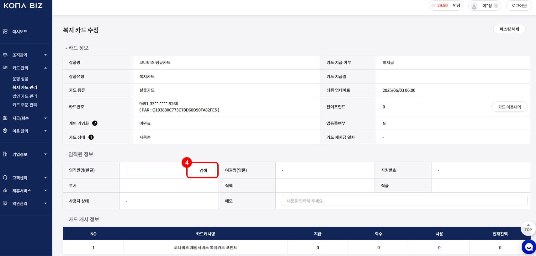 임직원 정보를 등록하거나 수정하면서 지급카드 정보를 수정할 수 있습니다.