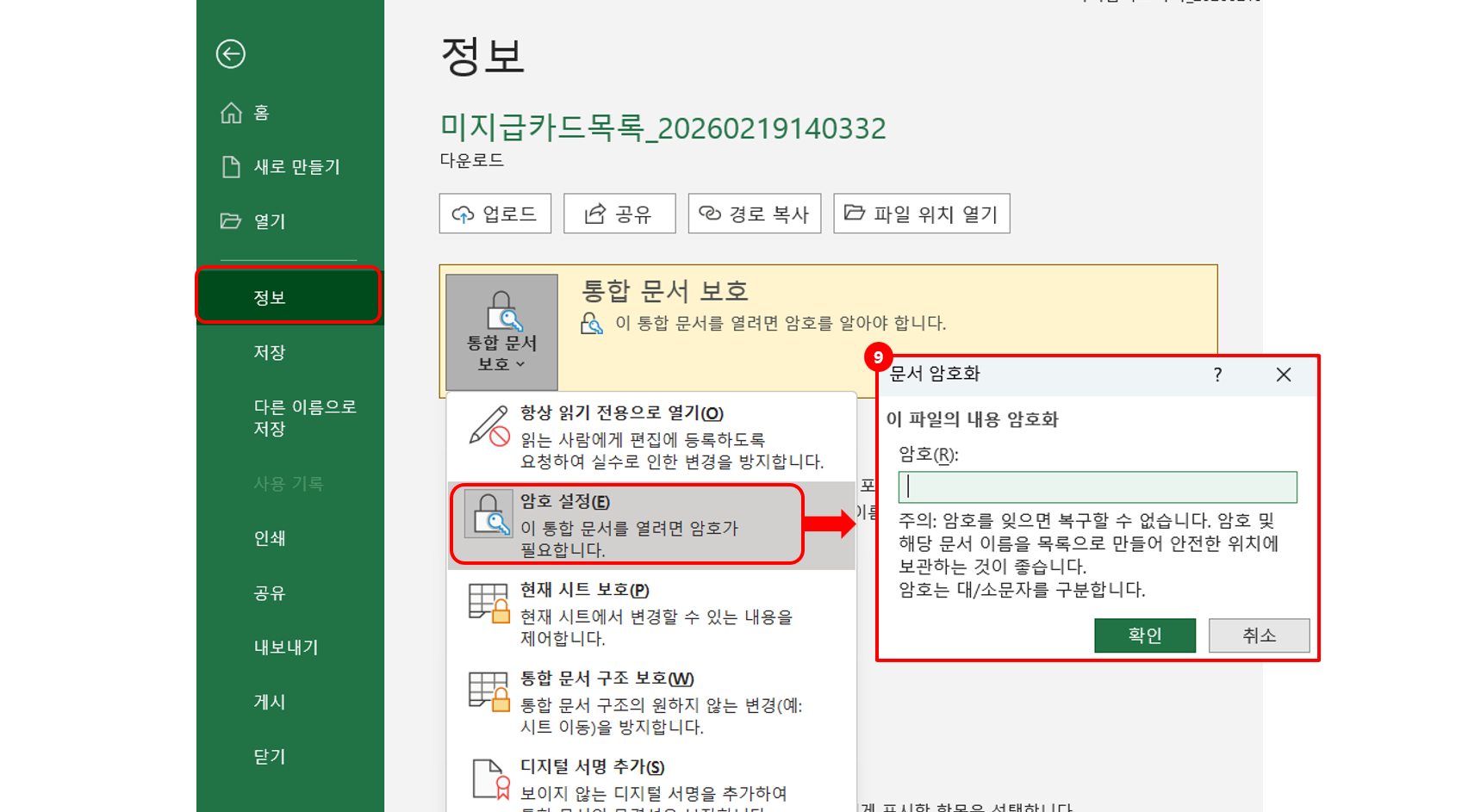 [정보]-[통합 문서 보호]-[암호 설정]-암호 삭제-[확인]