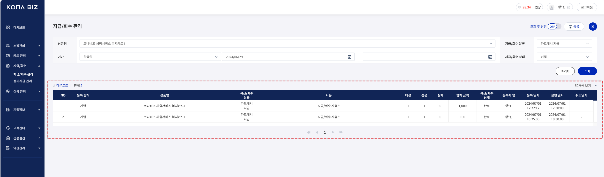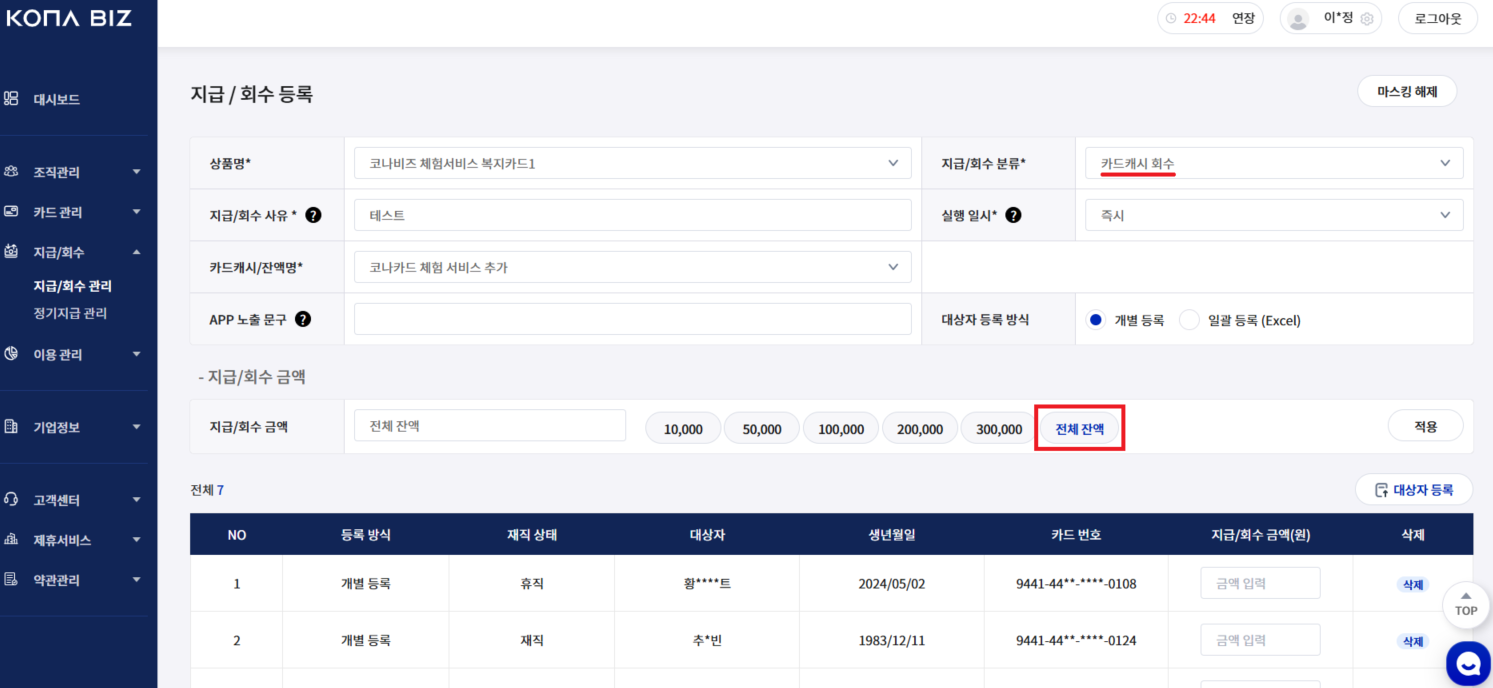 *카드캐시/잔액명 | 지급/회수 할 캐시 선택 |