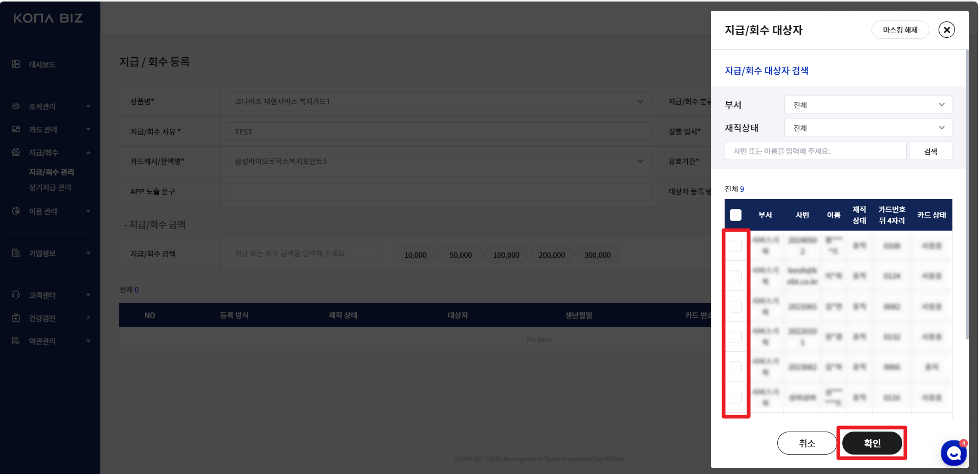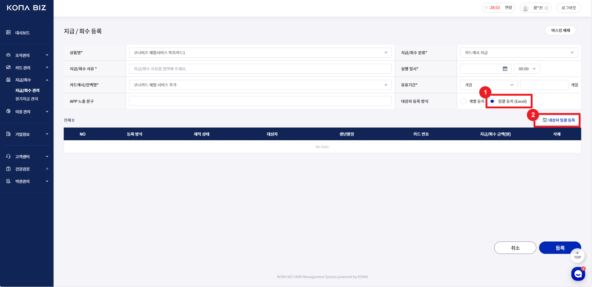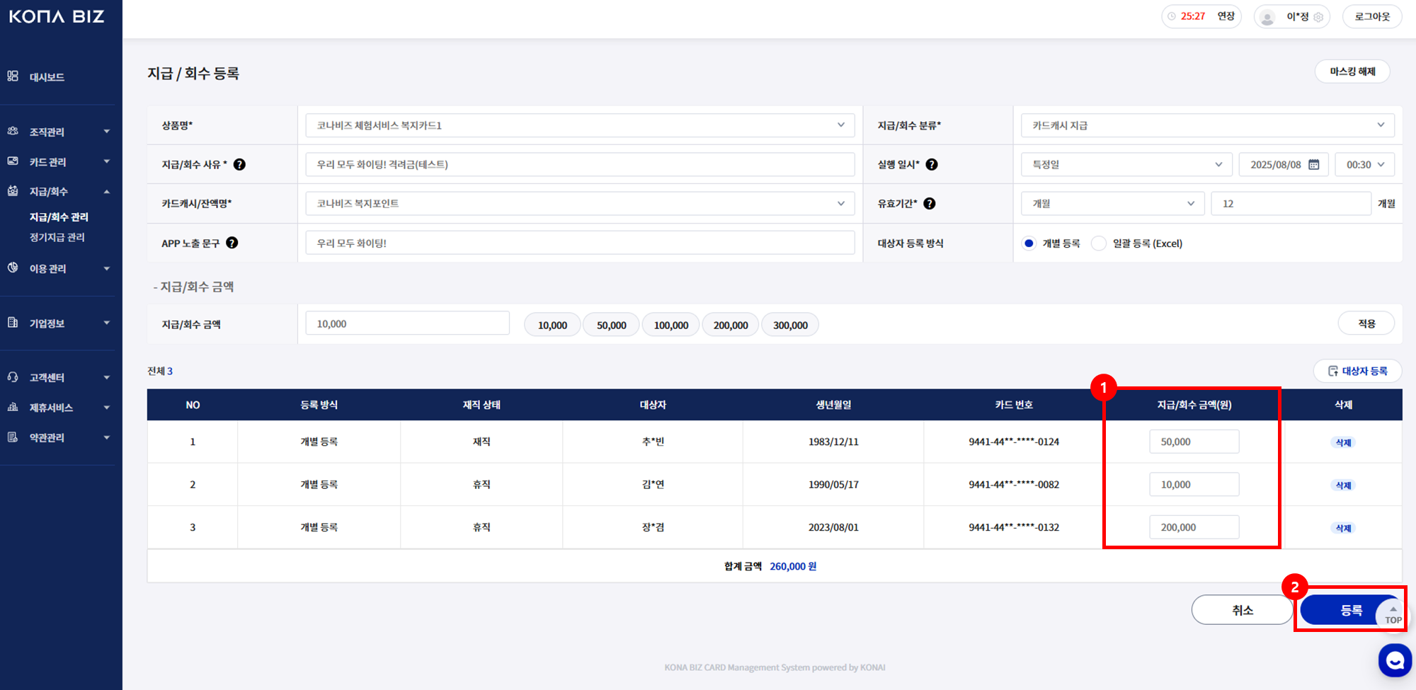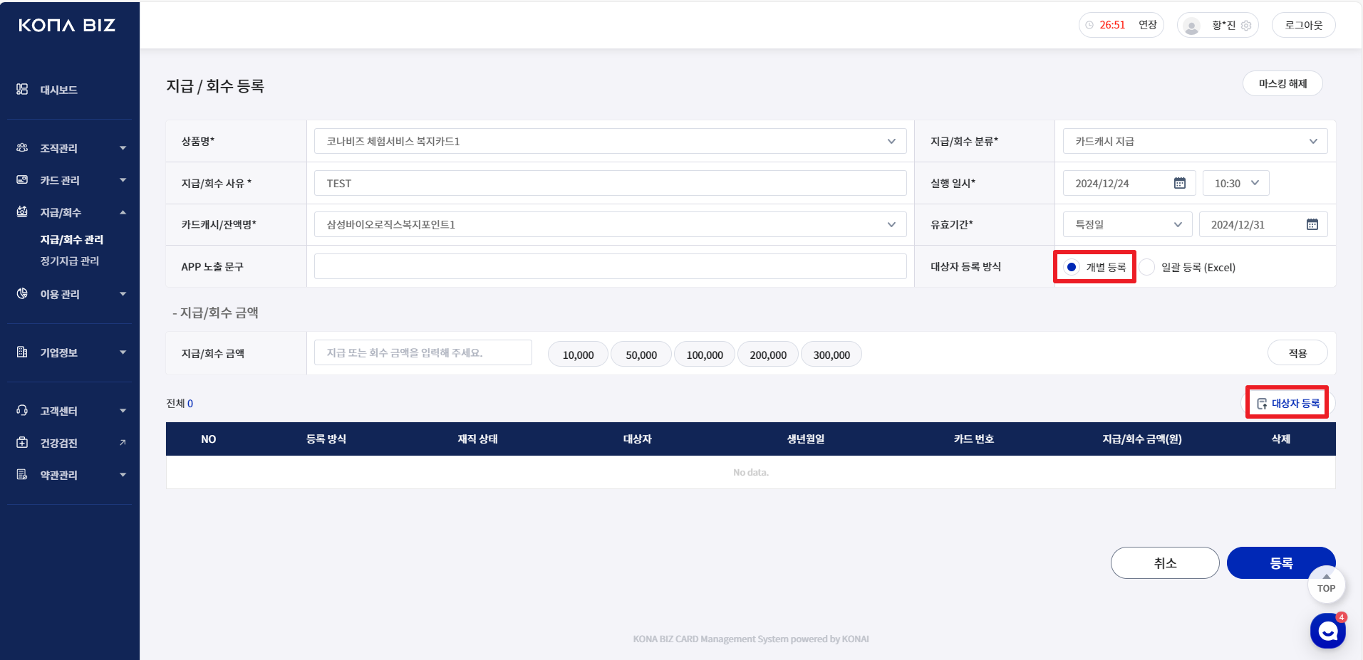 지급/회수에 대한 정보를 입력합니다. 개별/일괄 등록이 가능합니다.
